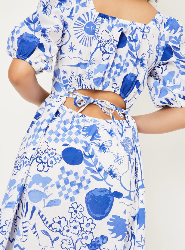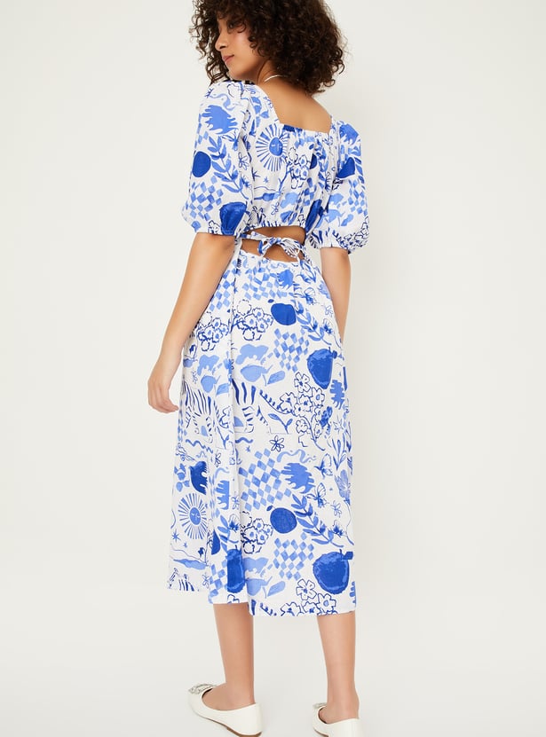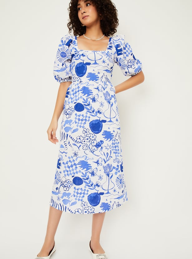 Turn heads with this printed styled back midi dress, designed to make a statement. Featuring a charming square neck and playful puff sleeves, it combines elegance with a touch of drama. The styled back detail adds an unexpected flair to this classic silhouette.