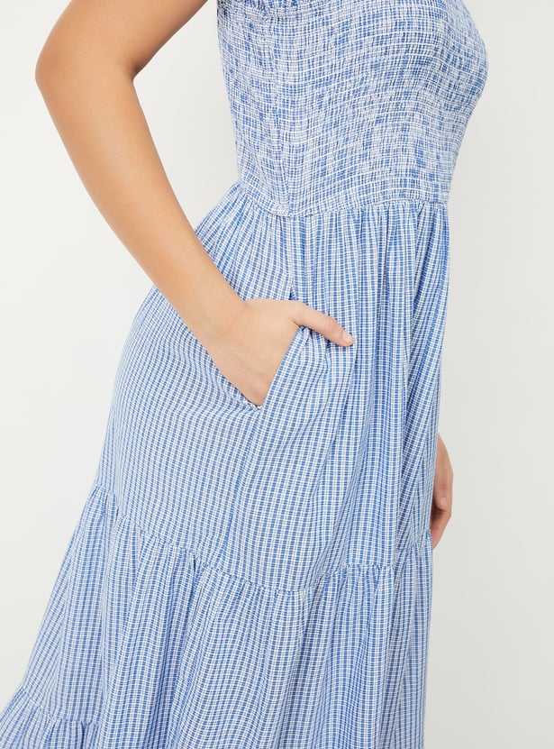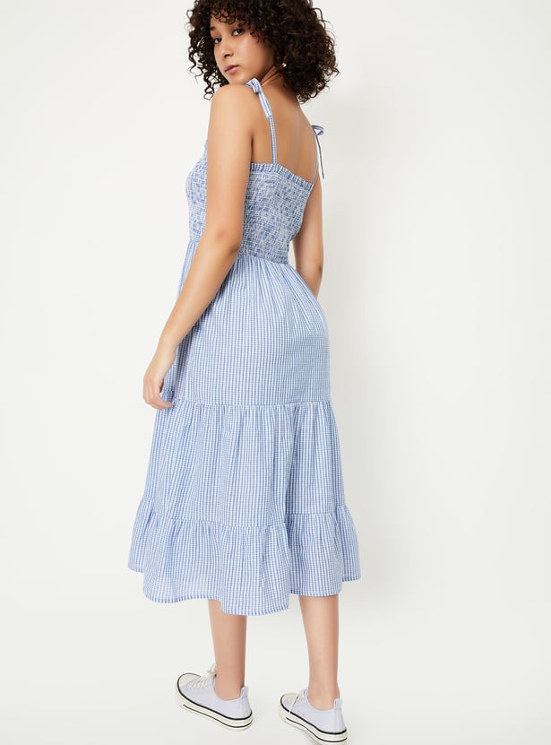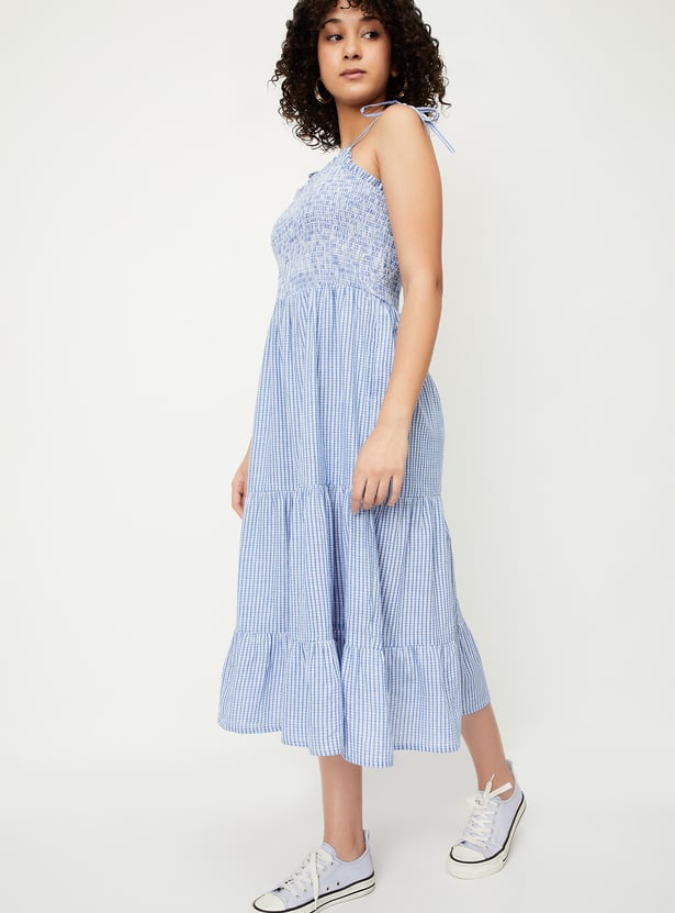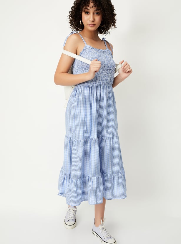 Embrace a breezy, feminine look with this printed tiered midi dress, perfect for warmer days. Featuring delicate spaghetti tie-up straps, smocked surface, and a flattering A-line silhouette, it’s both stylish and comfortable.