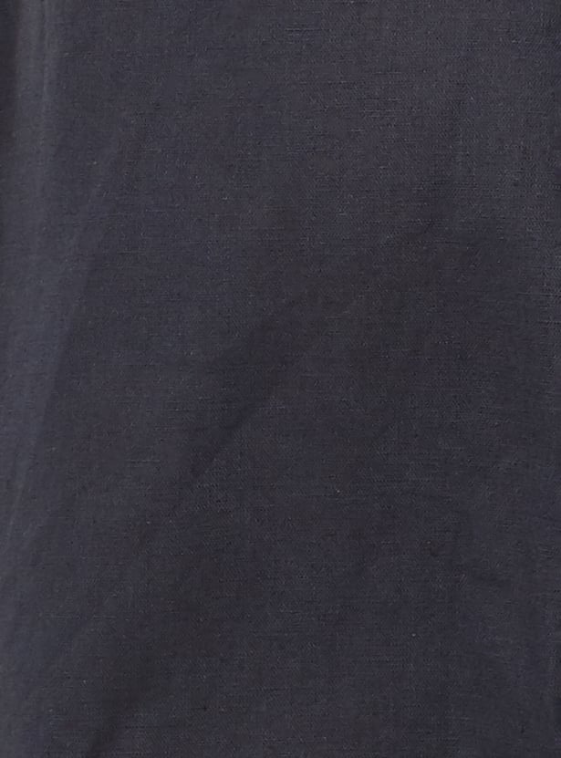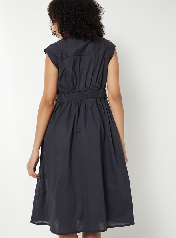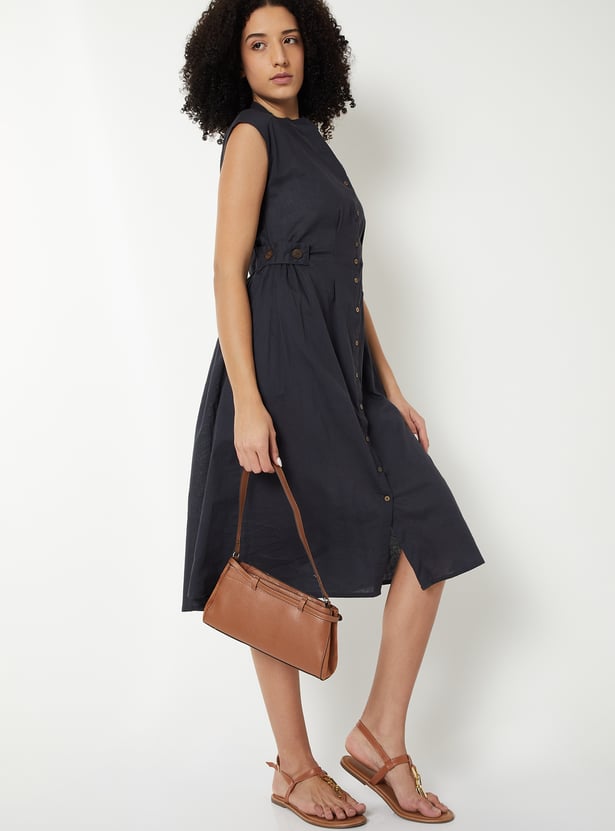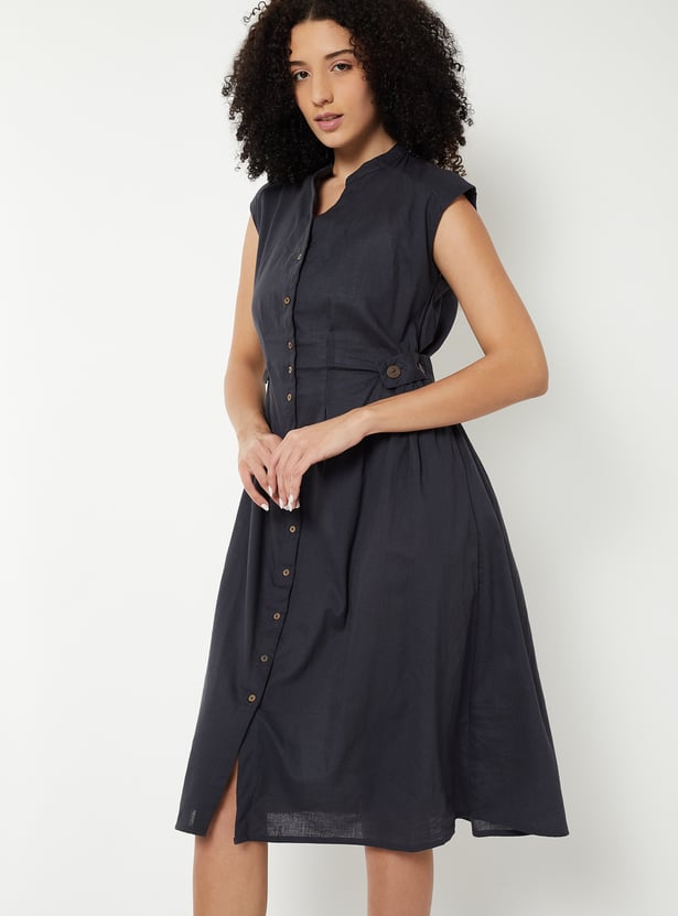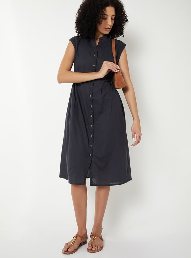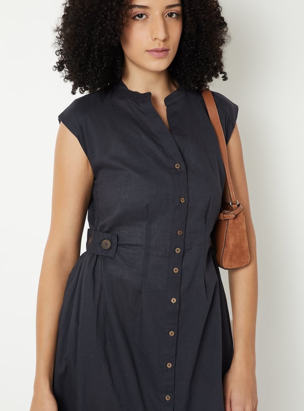 Elevate your everyday elegance with this solid sleeveless midi dress. Featuring a band collar, elasticated waist detailing, side pockets, button placket, it offers refined comfort and effortless style.