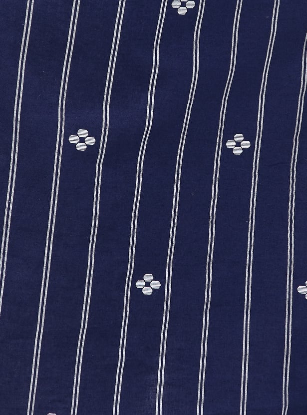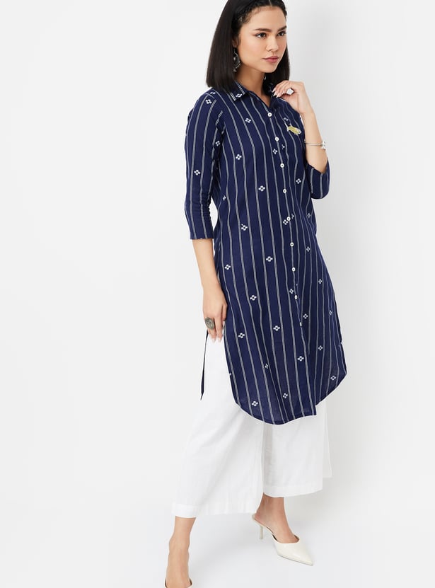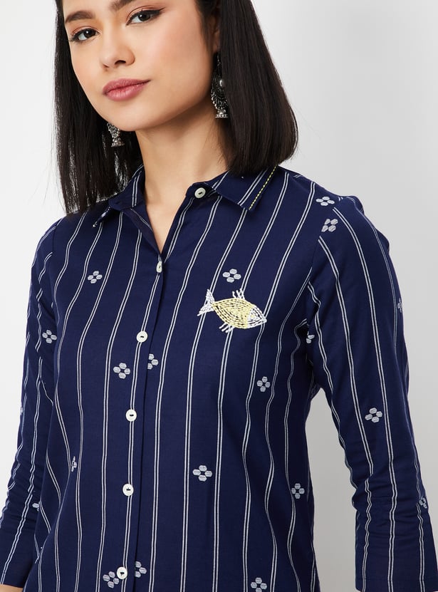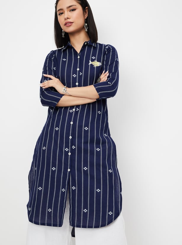 Look elegant in this kurta. The straight profile features striped woven patterns and a fish applique. It has a spread collar, three-quarter sleeves, and a high-low hem.