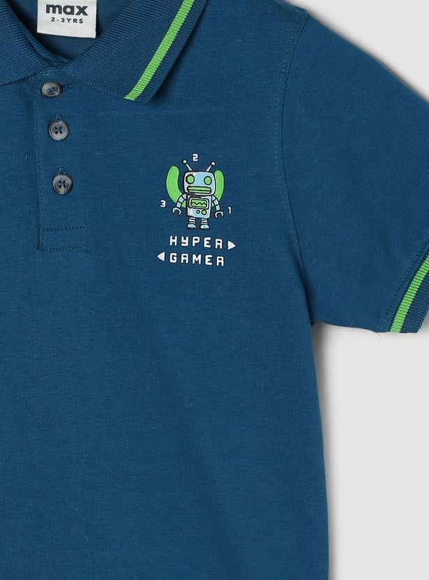 An ideal pick for your little one's casual wardrobe, this graphic print T-shirt is designed with half sleeves and a polo neckline.