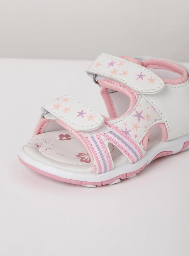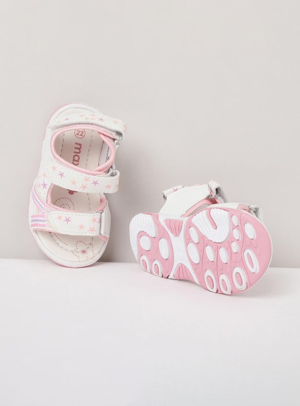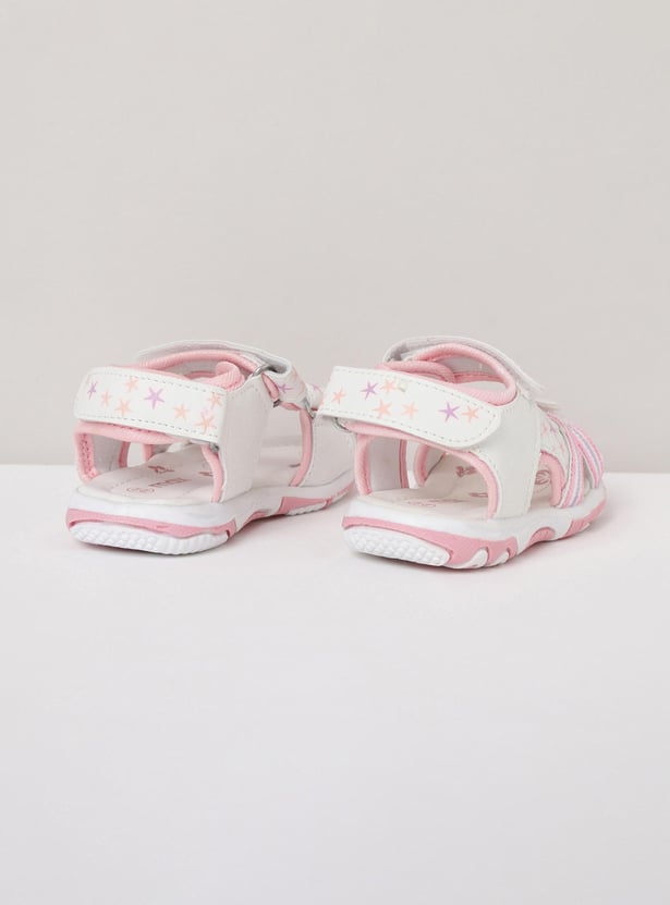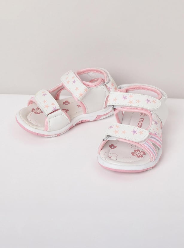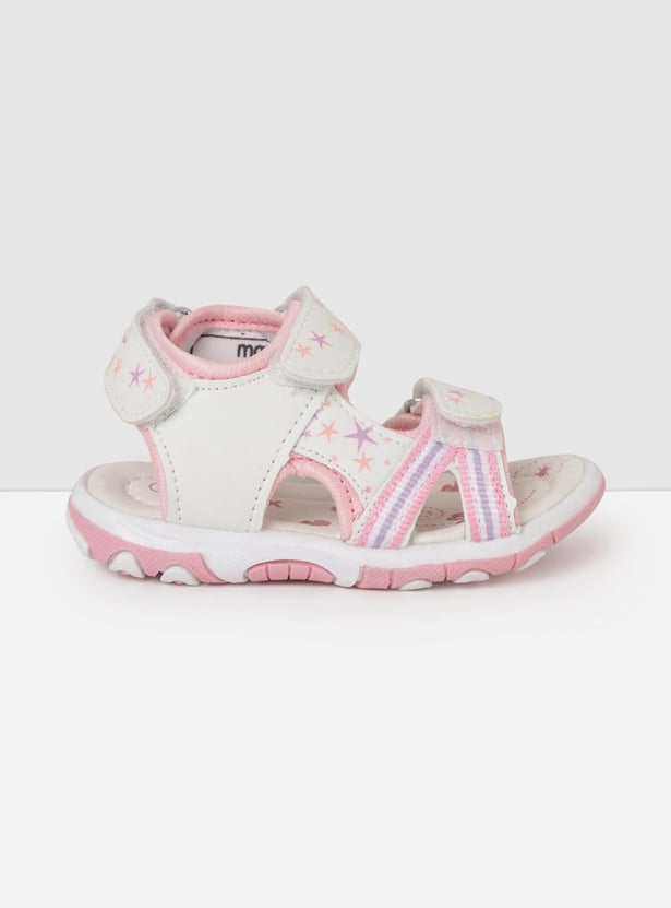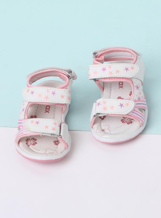 Detailed with star prints on the surface, this pair of sandals comes with an open-toe construction and velcro straps. The grooved soles have been added to give maximum grip and comfort to the little one.
