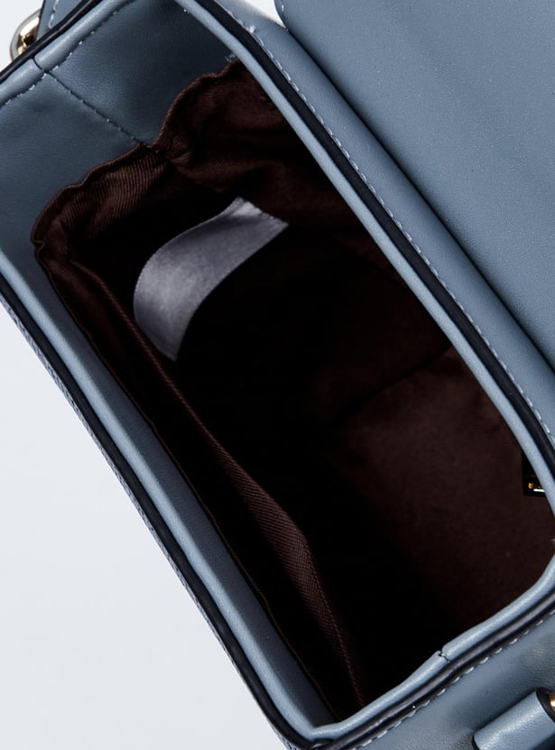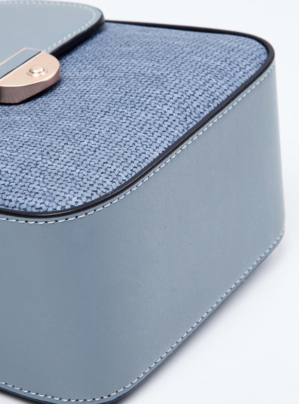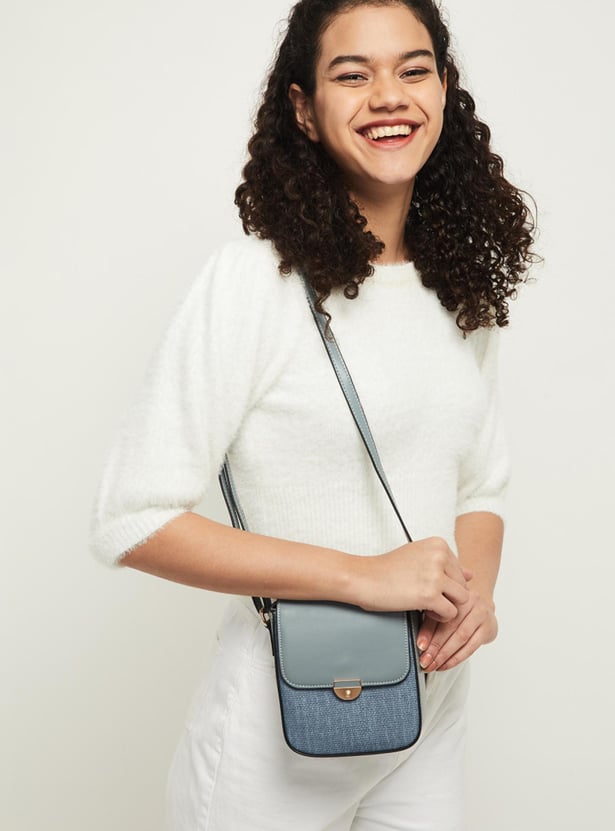 A neatly tailored sling bag detailed with a textured pattern on the surface, adjustable slings, and has a magnetic push-button closure.