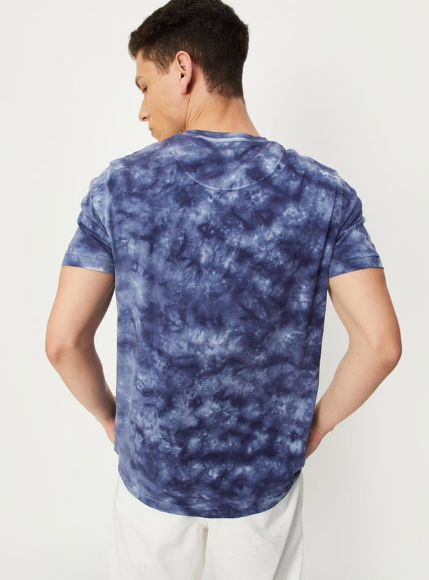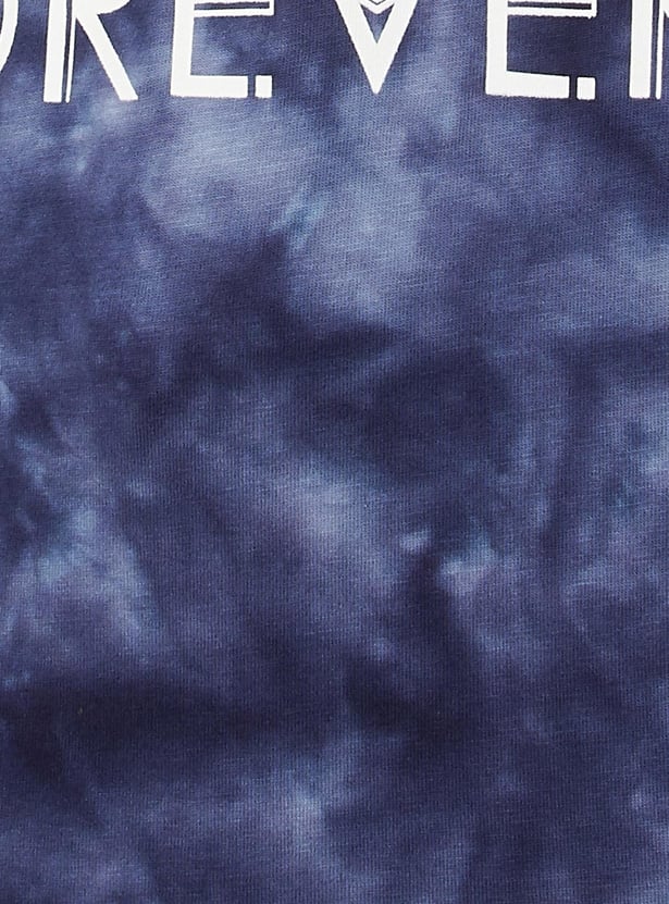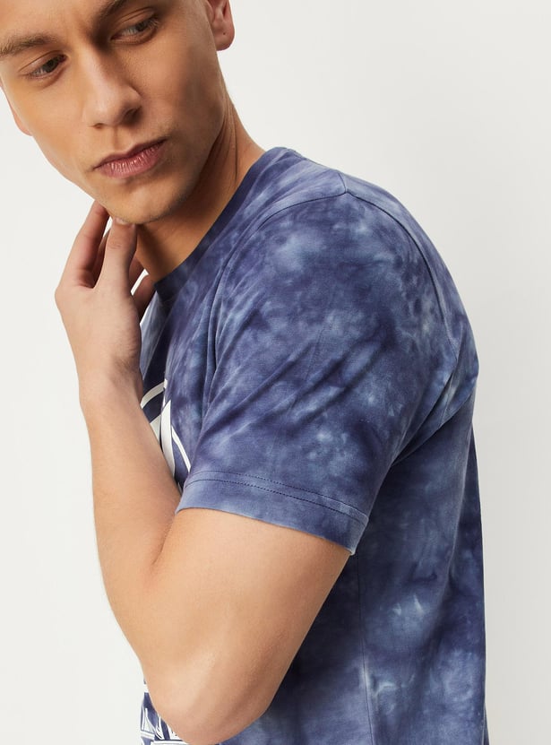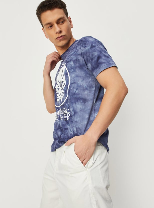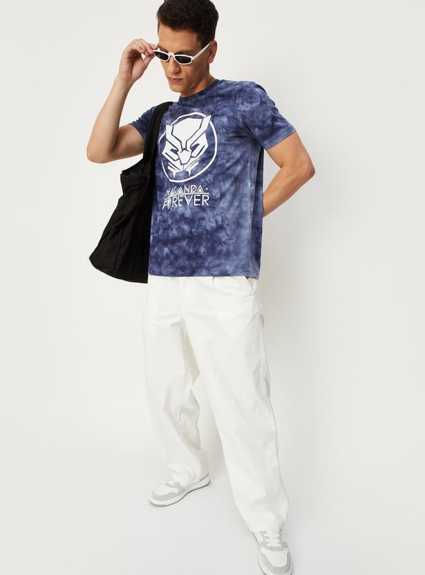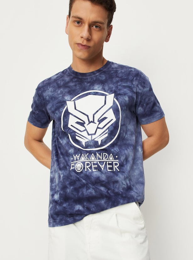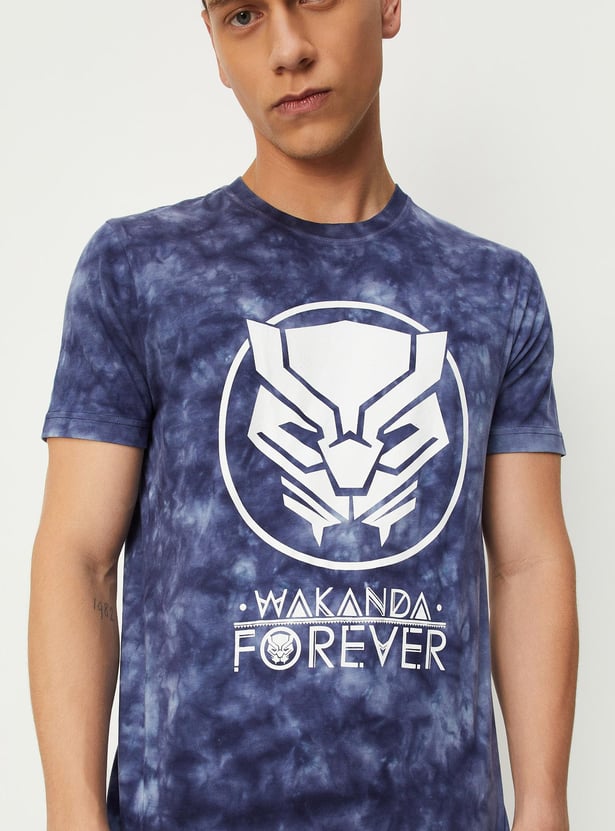Show off your fandom with this T-shirt. It is designed with a crew neck, short sleeves, Black Panther-themed graphic print on the chest, slim fit profile, and tie and dye pattern. Style this tee with trousers and sneakers to ace the look.