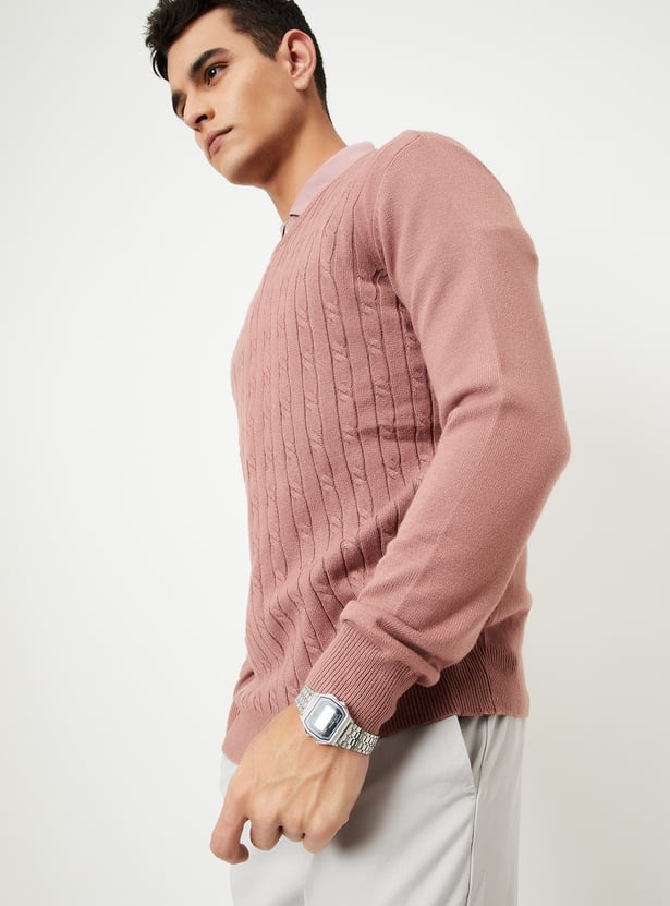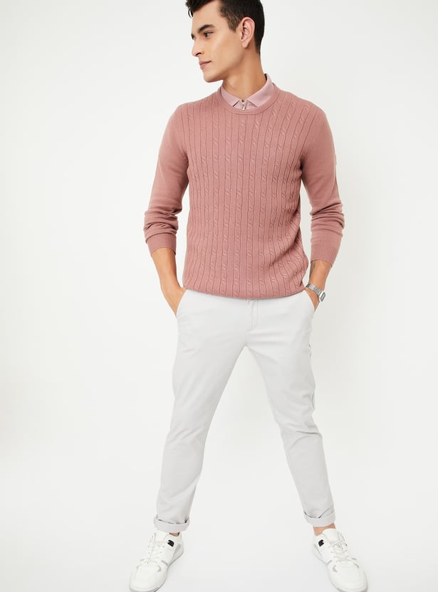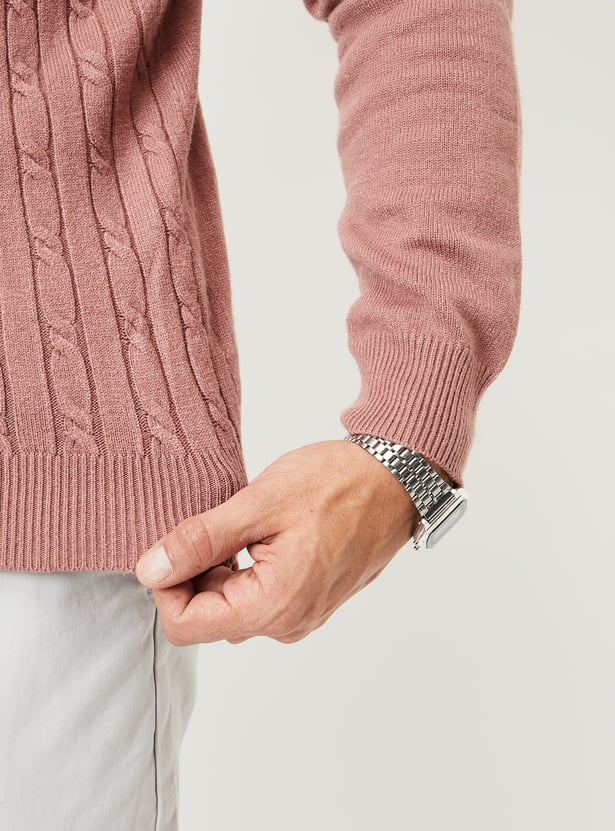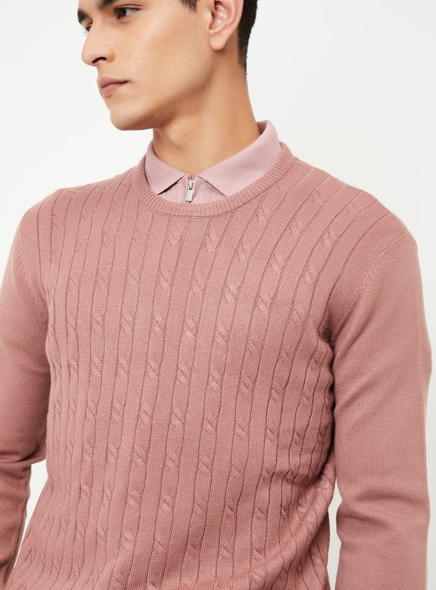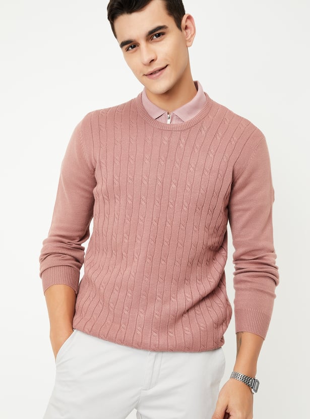 Classic warmth with a twist, this sweater features an intricate braided knit pattern. It has a round neck, a cable knit pattern for a classic look, and full sleeves. Ribbed trim adds a cosy touch.