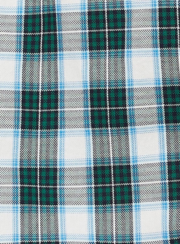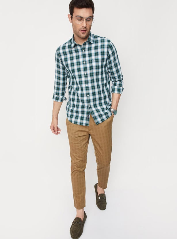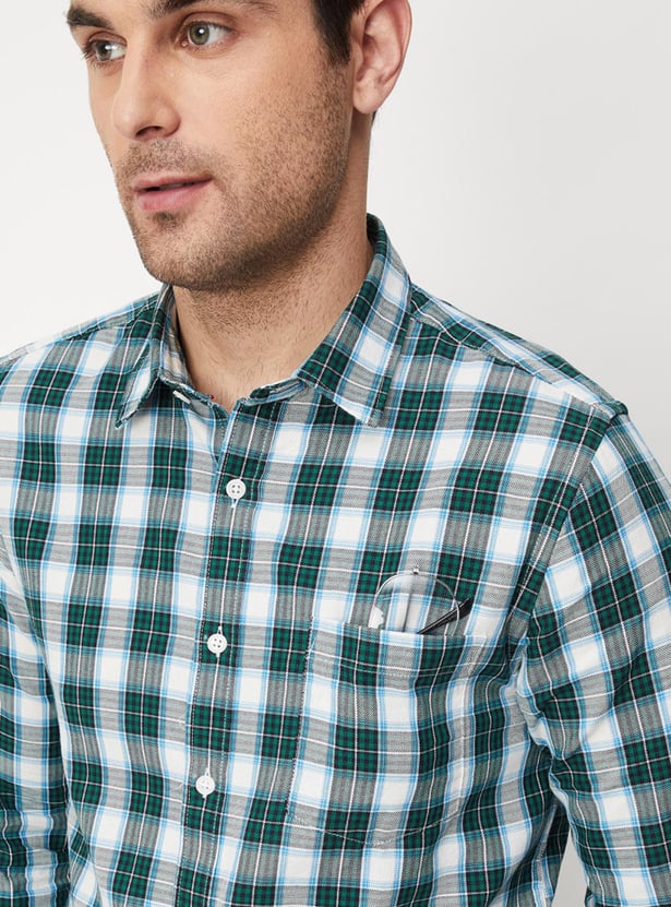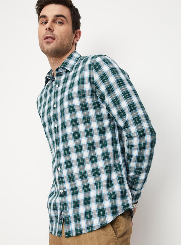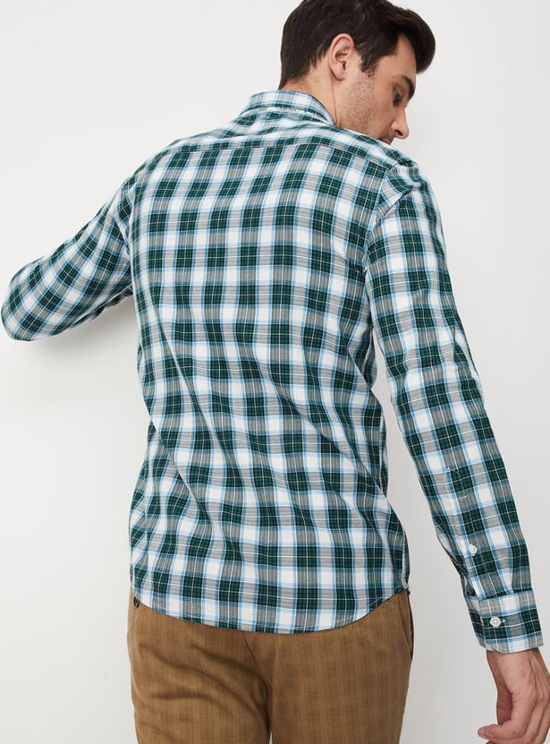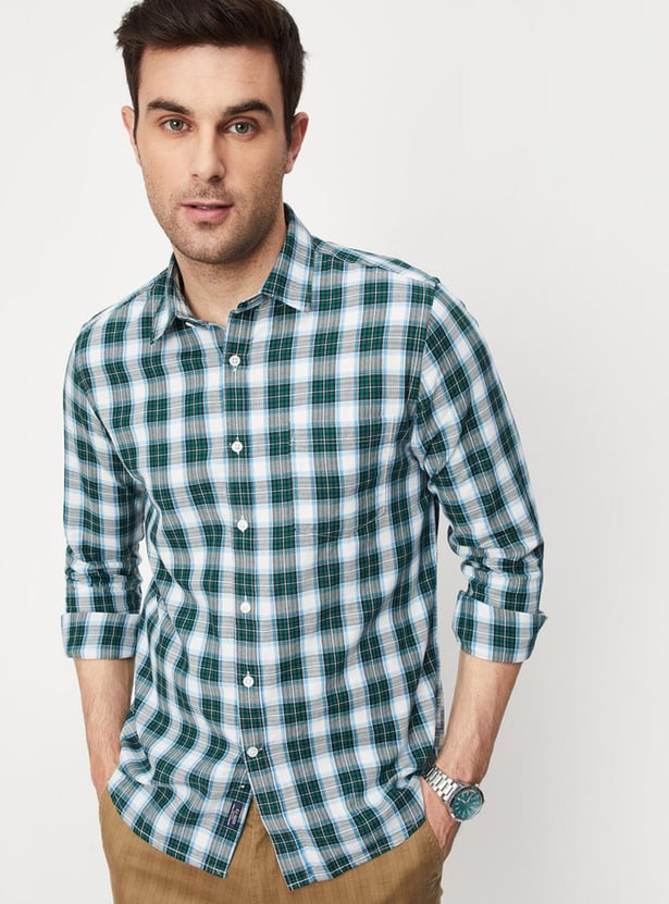 Get your casual collection to the next level with this checked shirt. It features a spread collar, long sleeves with button cuffs, a patch pocket, and a button placket. Make a stunning entrance by teaming this shirt with a pair of trousers and slip-on shoes.