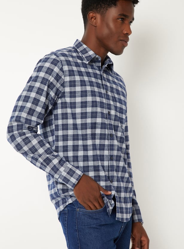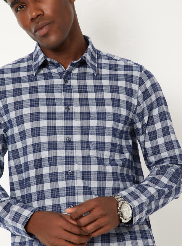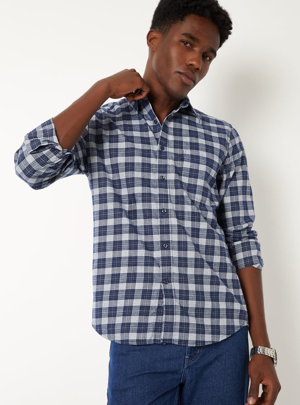 Sharpen your casual style with this checked slim fit shirt, featuring a spread collar, button placket, and full sleeves with button cuffs. A patch pocket adds a classic touch to this versatile staple.