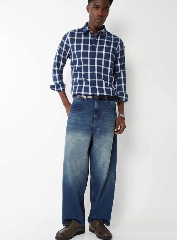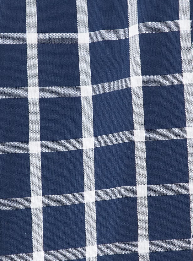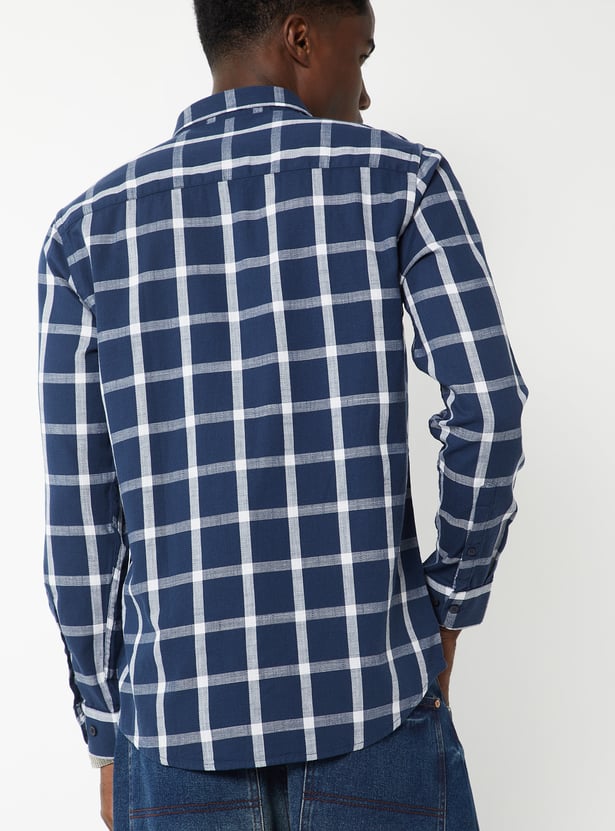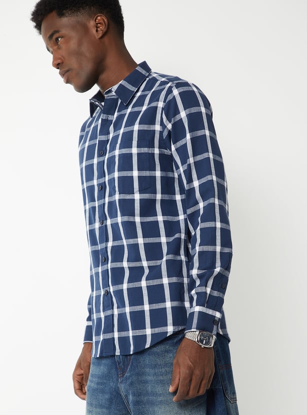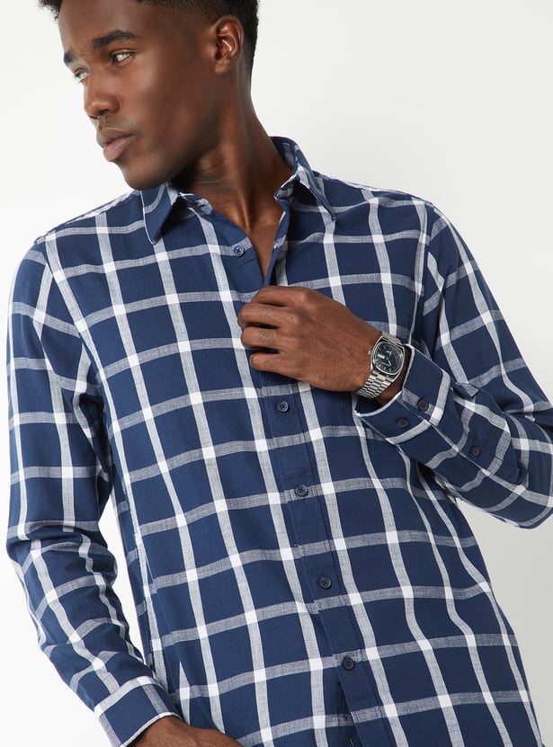 This checked slim-fit shirt is designed for a sharp, contemporary look. It features full cuffed sleeves, a button-down front, a spread collar, and a curved hem for a refined finish.