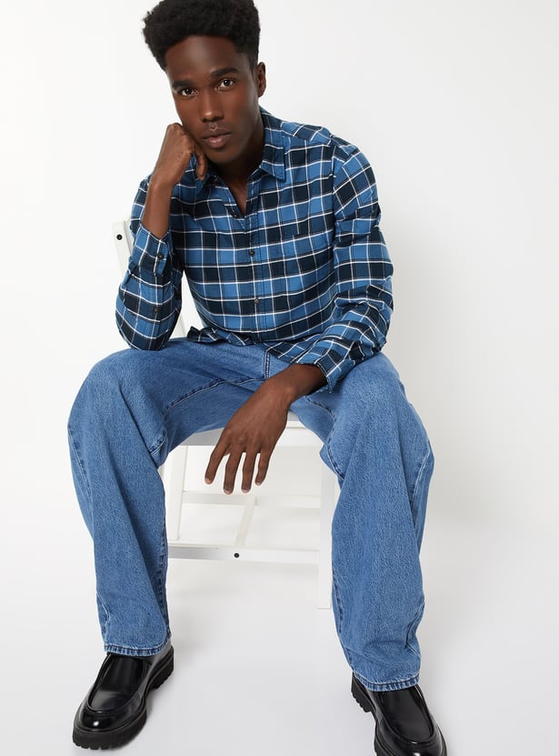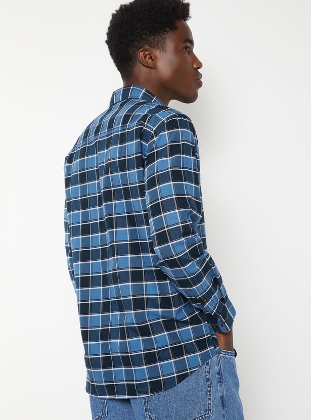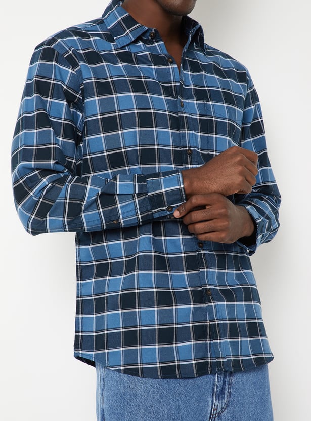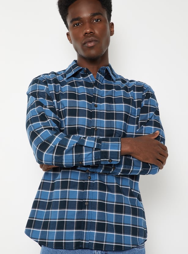 Add timeless charm to your wardrobe with this checked regular fit shirt. It features a spread collar, full sleeves with button cuffs, and a classic patch pocket for a smart, versatile look.