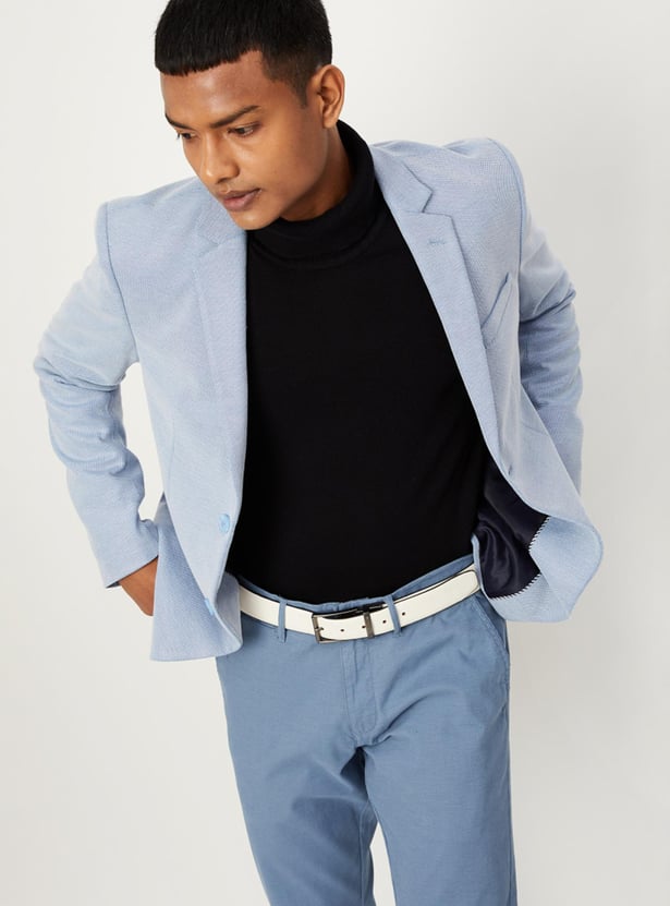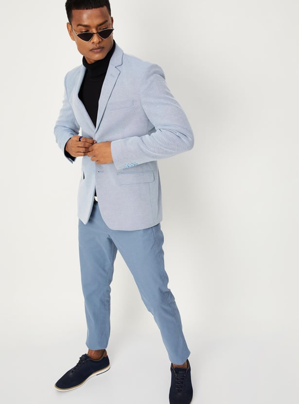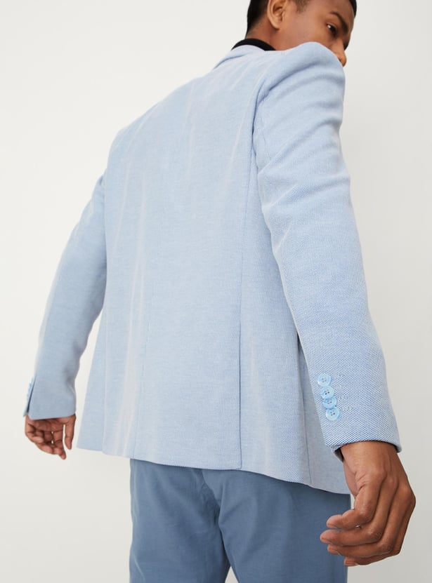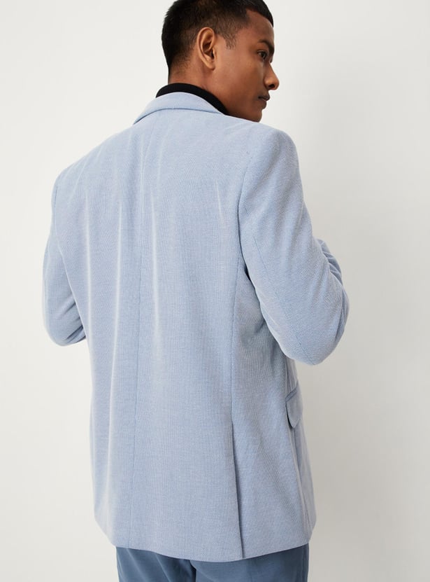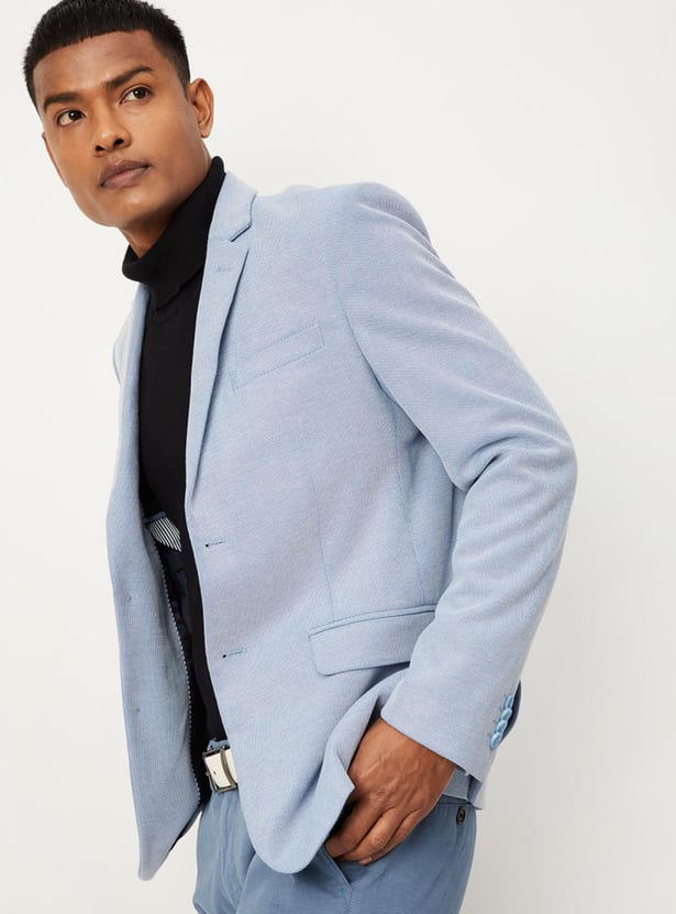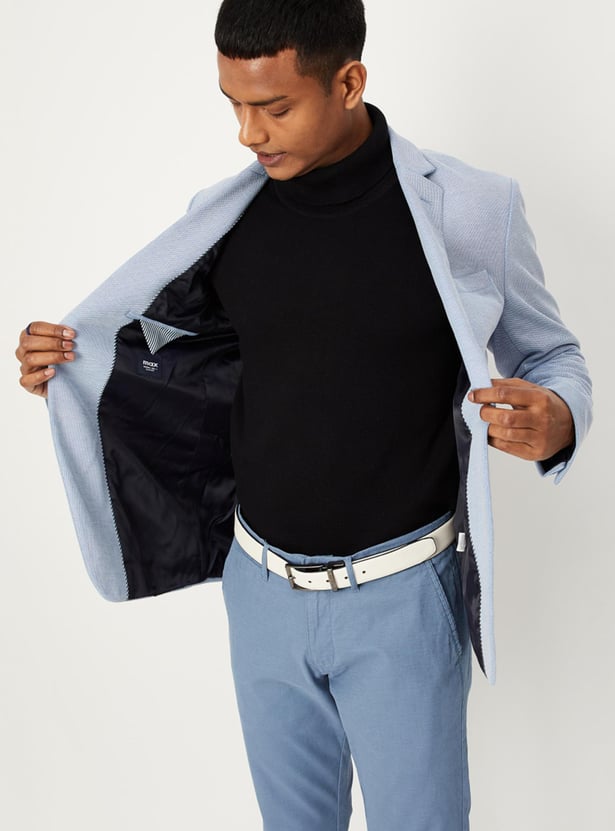Tailor your looks with this blazer that is updated with a textured pattern. It is styled with a lapel collar, long sleeves, back vents, a chest welt pocket, and flap pockets at the waist. For casual, sophisticated styling, layer this blazer over a polo sweater and pair it with chinos and casual lace-ups.