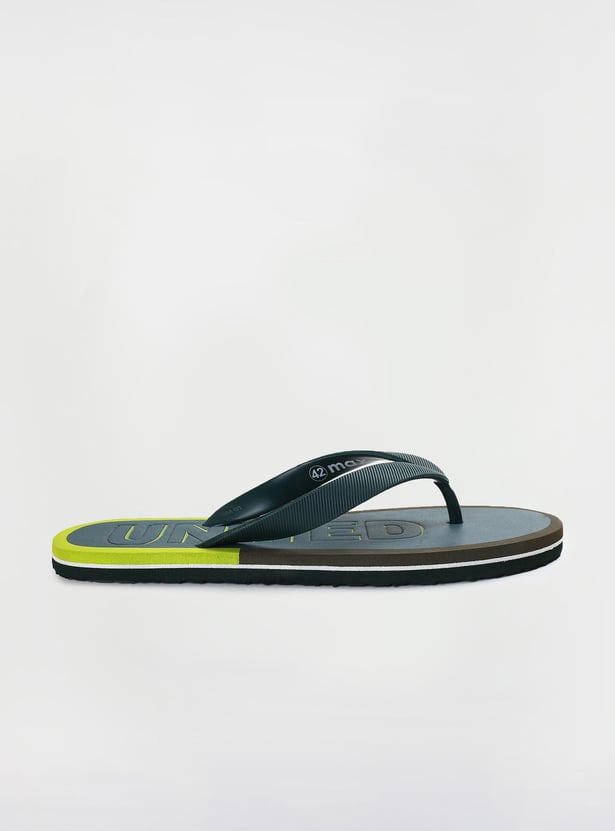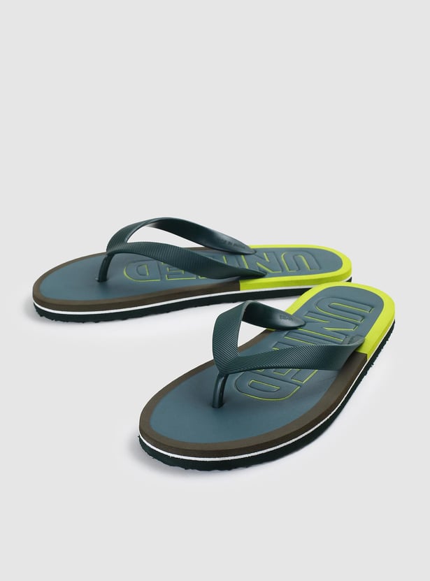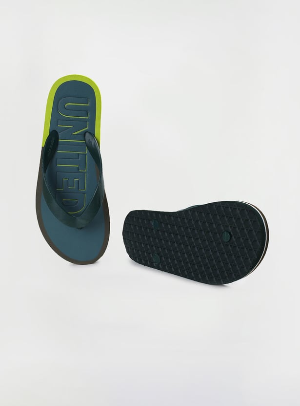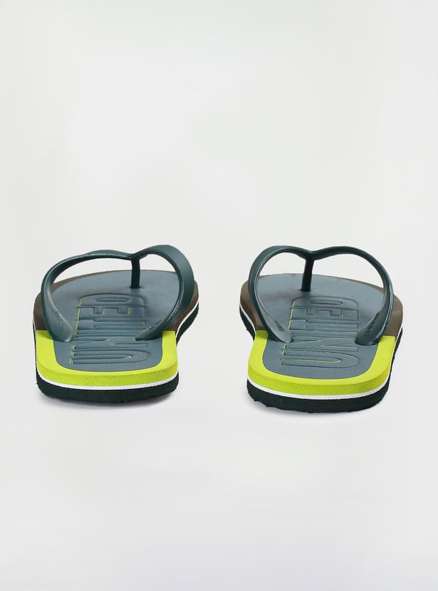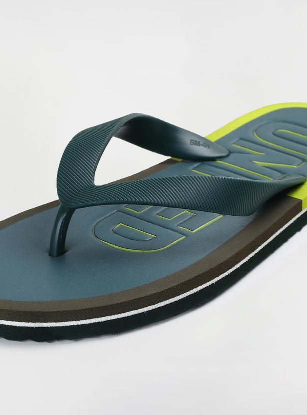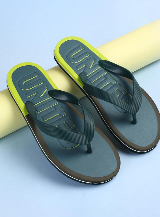 Your feet will have the utmost comfort and ease while walking with this pair of slippers. It is a must-have addition to your casual outing footwear collection and is enhanced with a colorblocked design, typographic embossing, V-straps and a comfortable footbed.