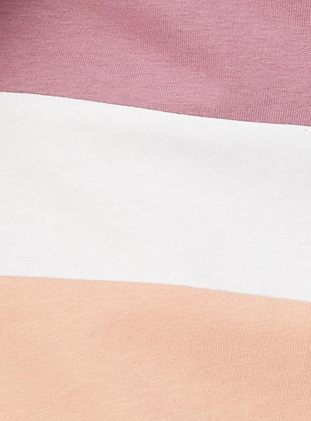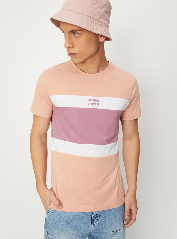 Switch up your basic style with this T-shirt highlighted with a colourblock design t. It has a crew neck, typographic print, short sleeves, and a slim fit profile. Pair this tee with jeans and sneakers to ace your street look.