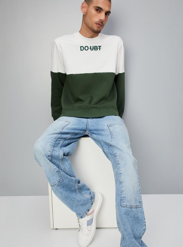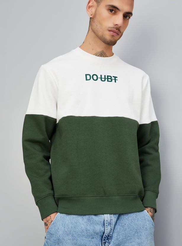 Your casual wardrobe will be complete with this colourblocked sweatshirt with a crew neck and long sleeves. Style it with a tee and dark jeans for an uber-cool look.