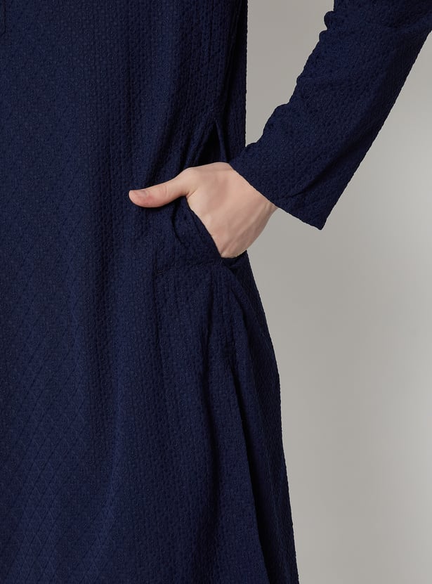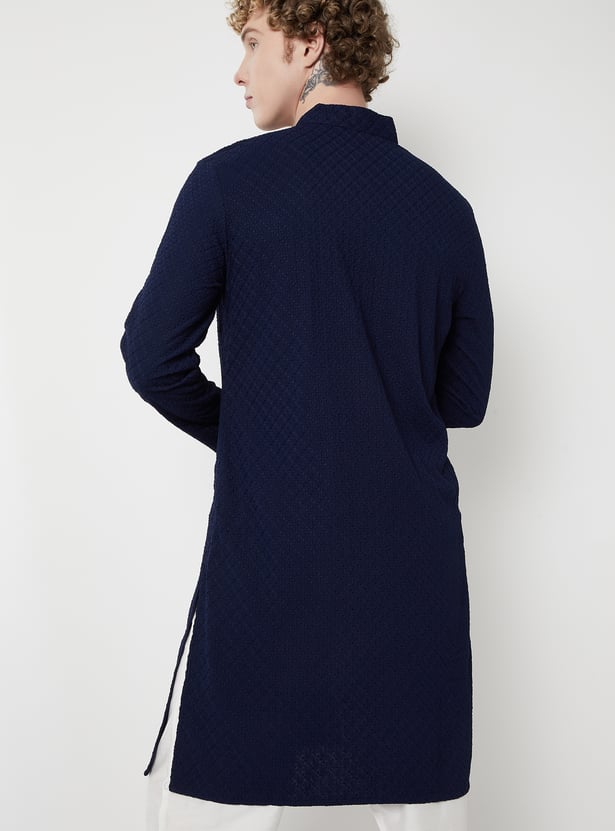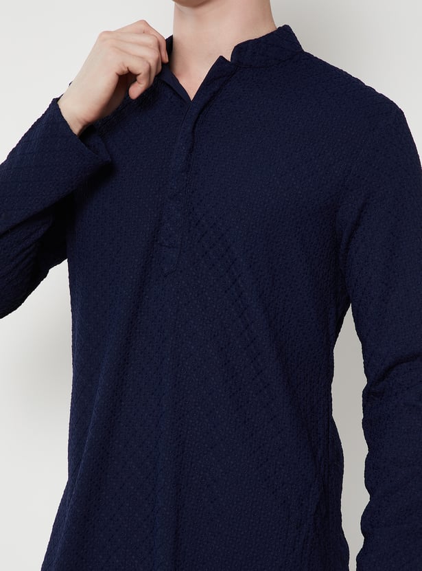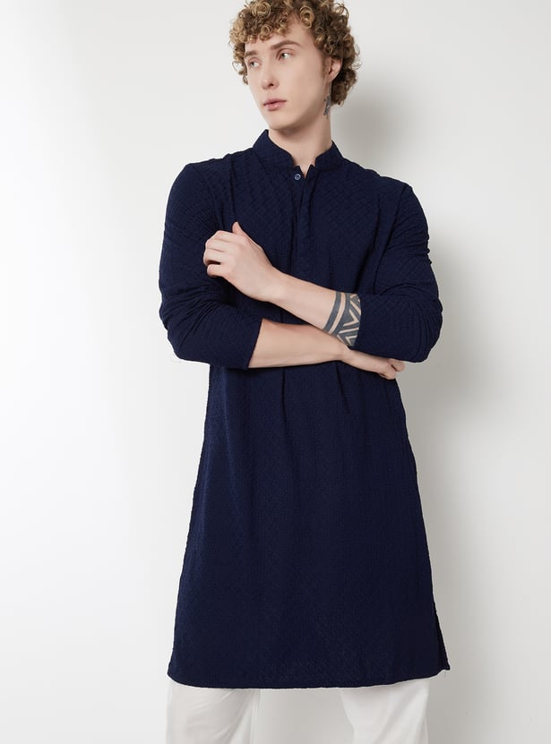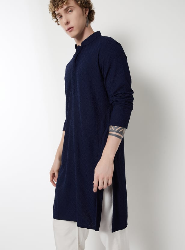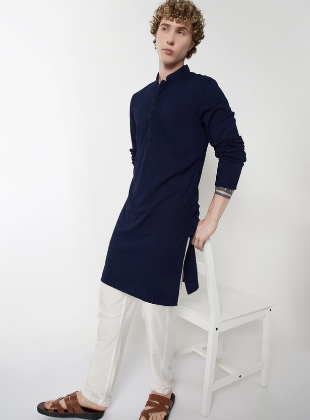 Effortlessly elegant, this embroidered slim fit long kurta blends tradition with modern charm. Featuring a band collar, half button placket, and full sleeves, it's designed for both comfort and style. Finished with side pockets and slits for ease of movement.