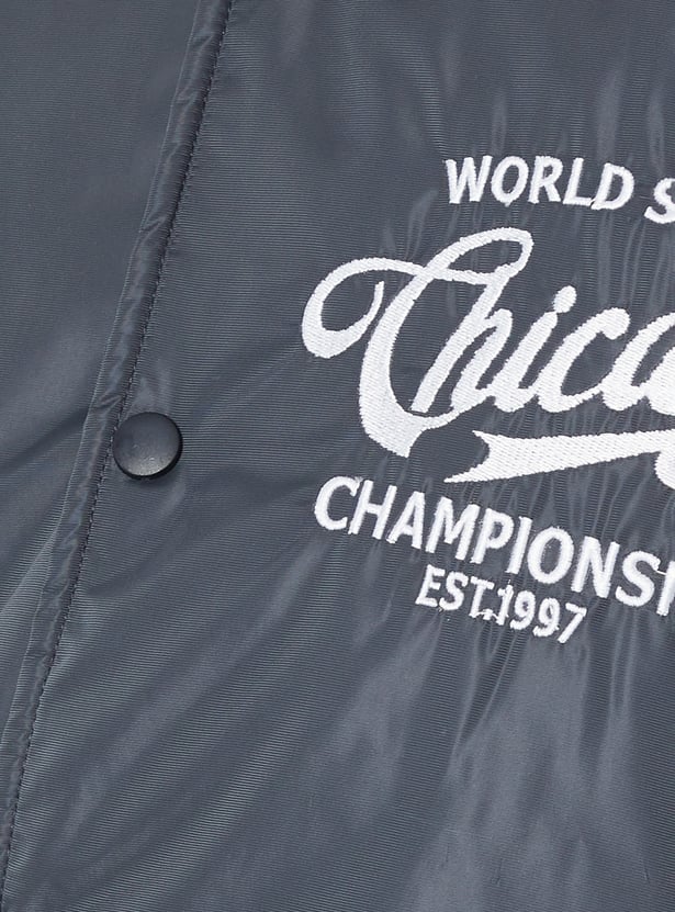 Sporty charm meets intricate detailing with this embroidered varsity jacket. Featuring a baseball collar, full sleeves, side pockets, and a classic button placket, it blends athletic appeal with stylish embroidery for a standout look.