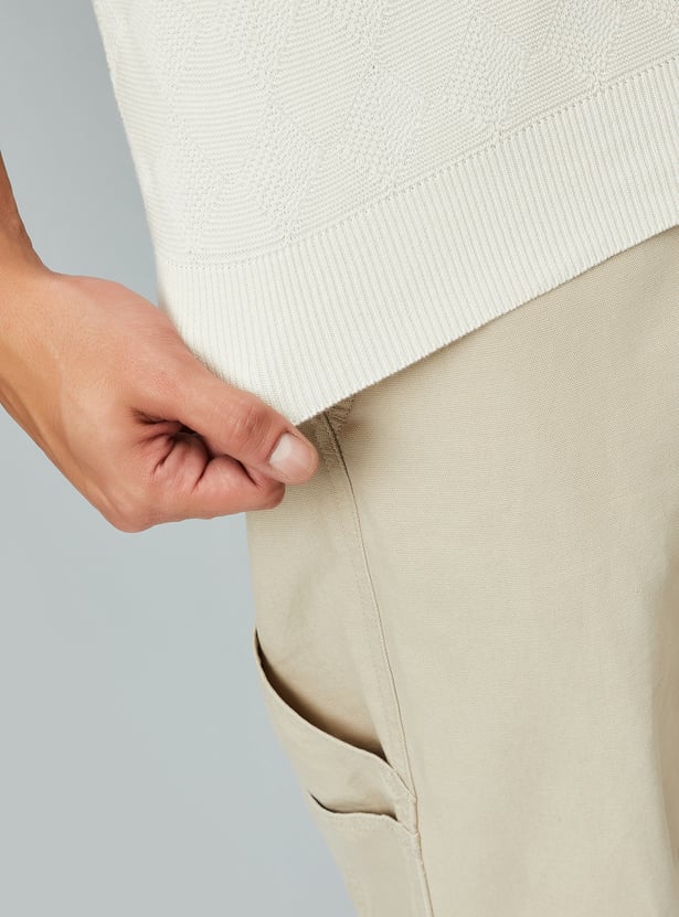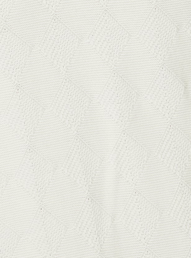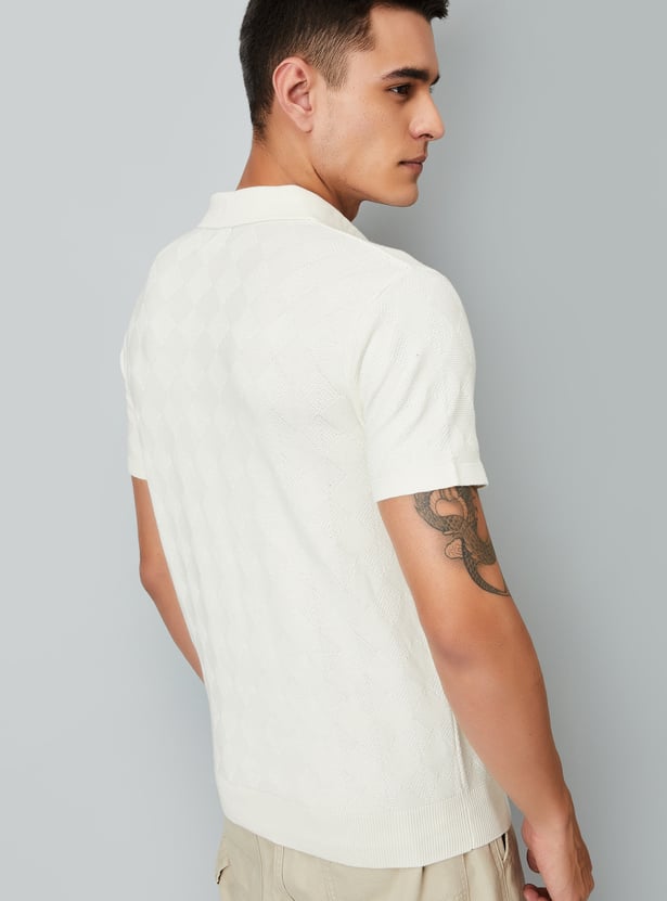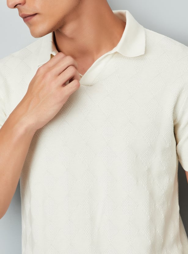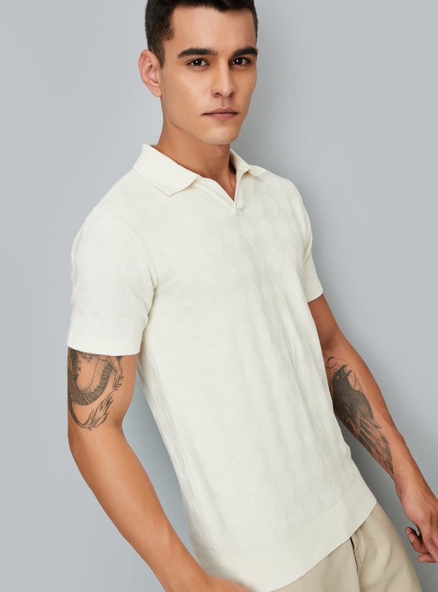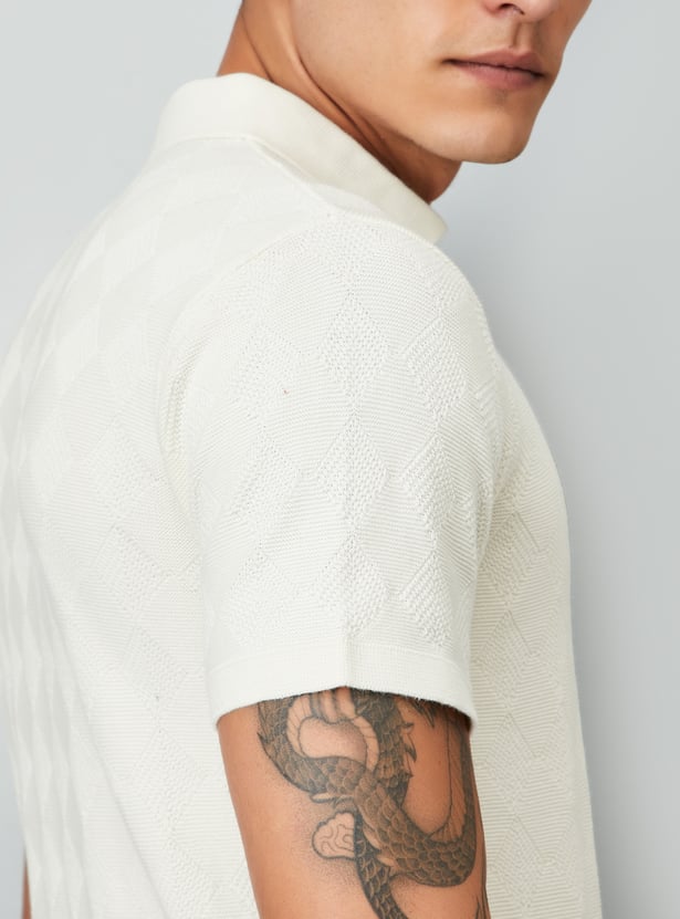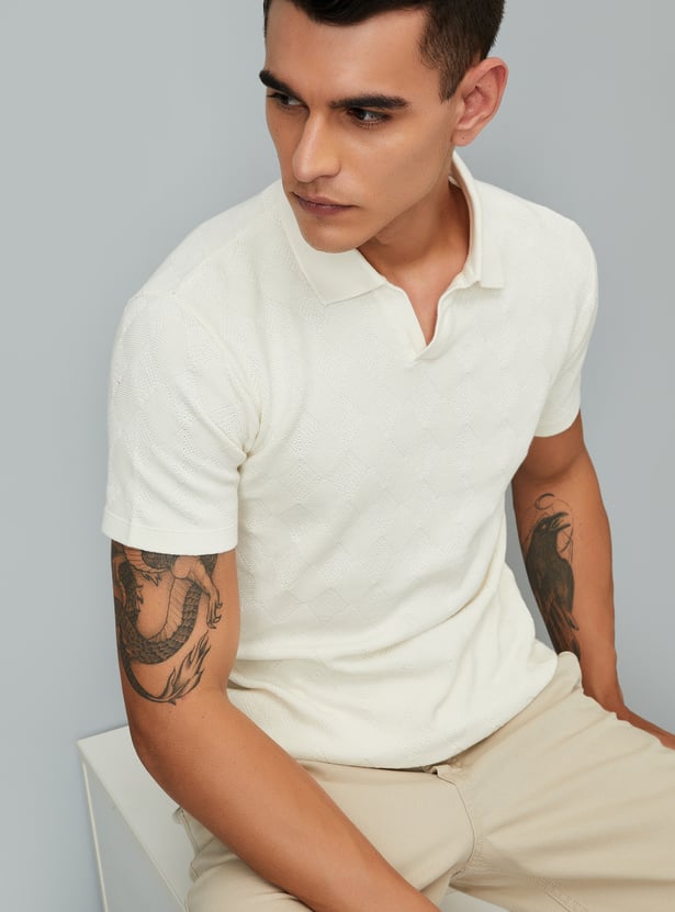 Step up your style with this t-shirt showcasing geometric knit patterns and a Johnny collar. The half sleeves and ribbed trim provide a comfortable, fitted finish.