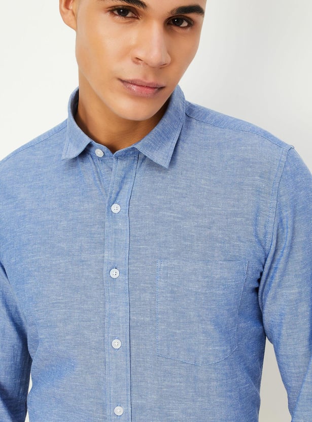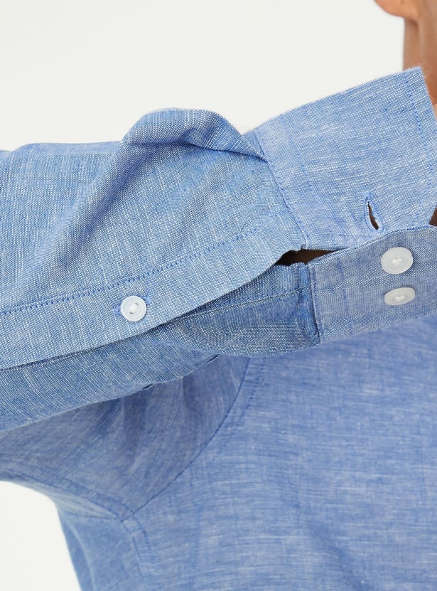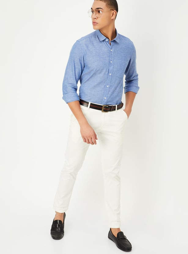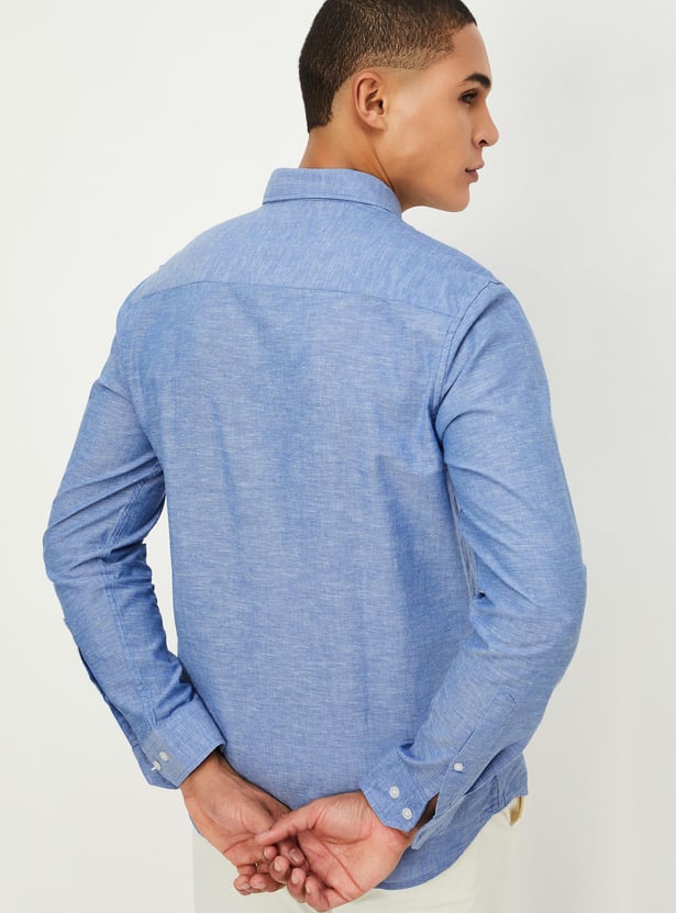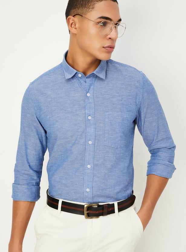 Indulge in understated sophistication with this heathered slim-fit casual shirt featuring a spread collar, full sleeves with buttoned cuffs, a front button placket, a patch pocket, and a curved hemline. The heathered texture adds depth and dimension to the fabric, creating a subtle yet stylish visual appeal. This shirt effortlessly combines a slim-fit silhouette with a textured finish, making it an essential addition to any modern wardrobe.