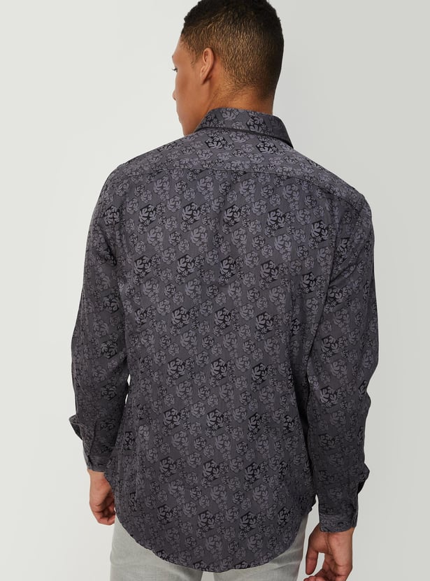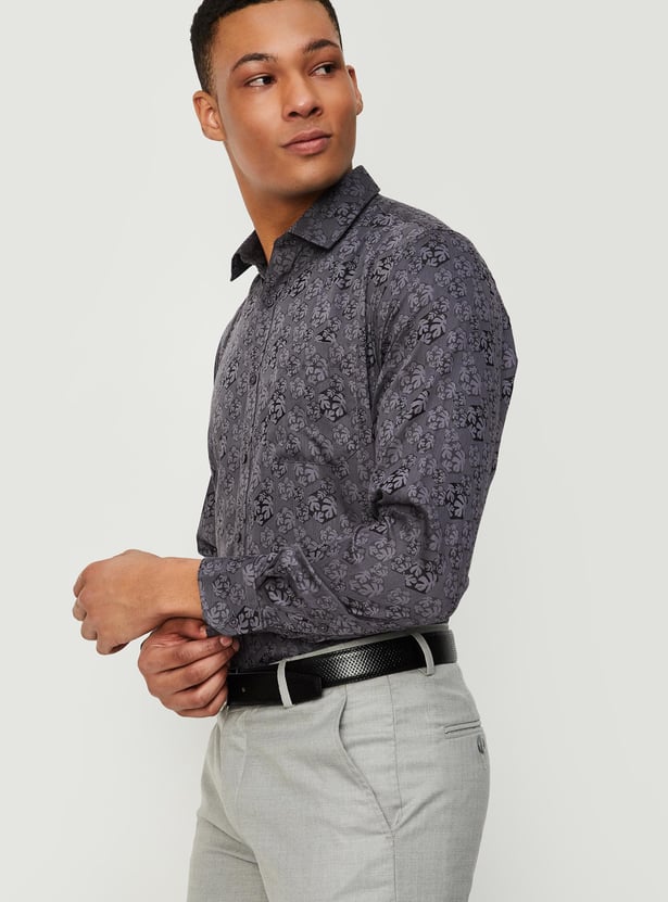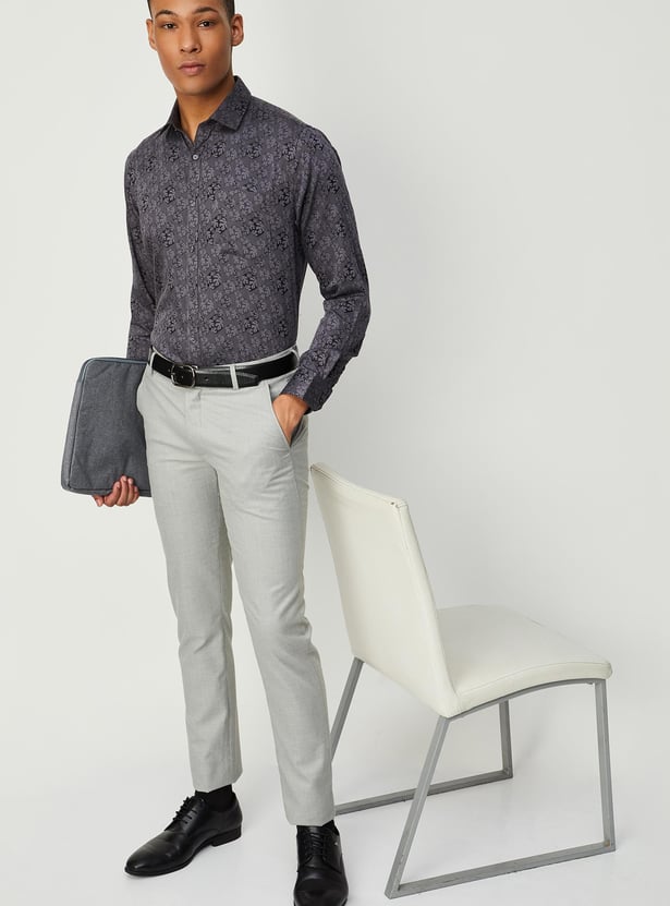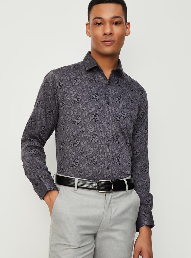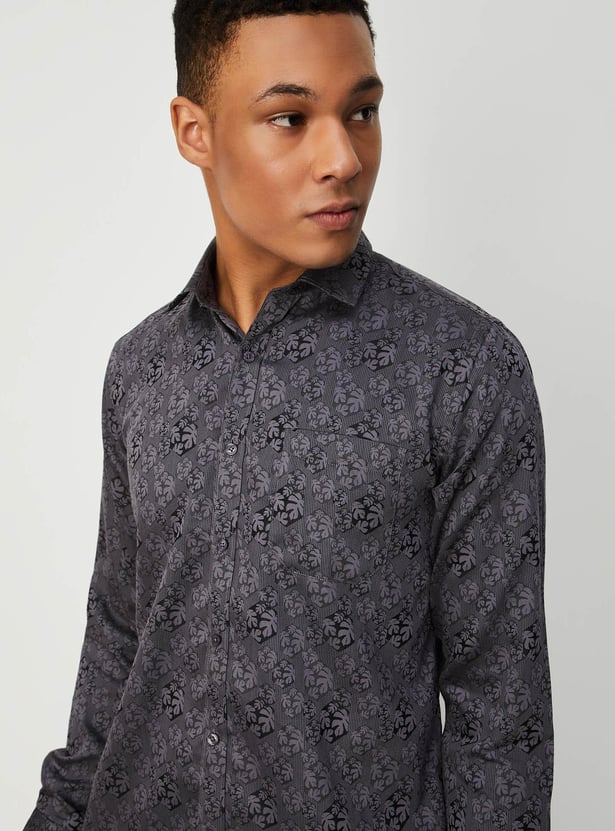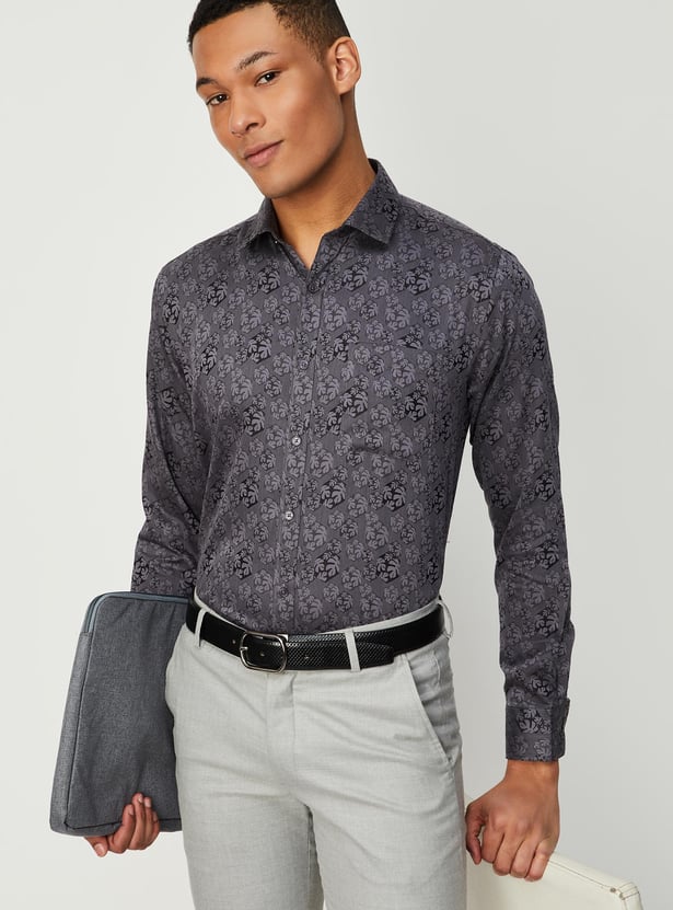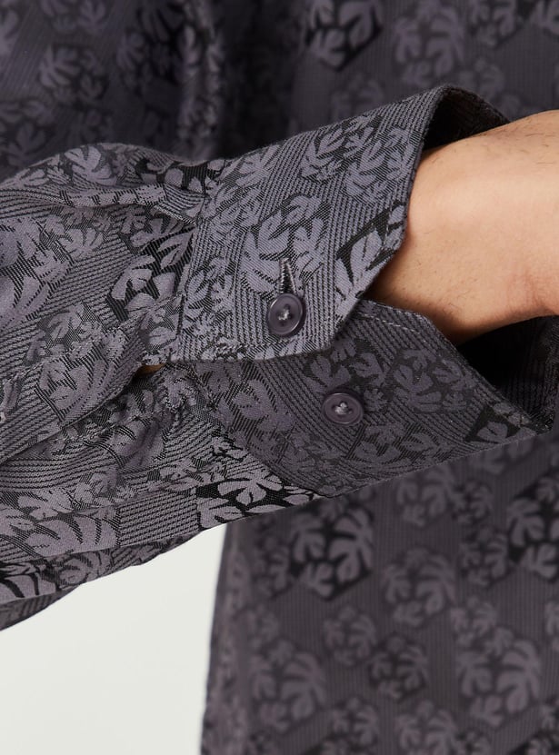 Look dapper in this formal shirt cut in a slim-fit profile. It is styled with a spread collar, full sleeves, buttoned cuffs, and a curved hem. The jacquard pattern and the patch pocket at the chest complete the look. Team up this shirt with a pair of trousers and oxfords to smarten your ensemble.
