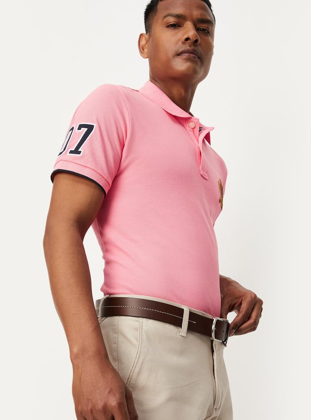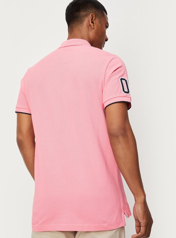A wardrobe staple, this T-shirt is styled with a polo collar and short sleeves. It is tailored in a slim fit profile with applique details. Amp your look by teaming this T-shirt with pair of trousers and casual lace-ups.