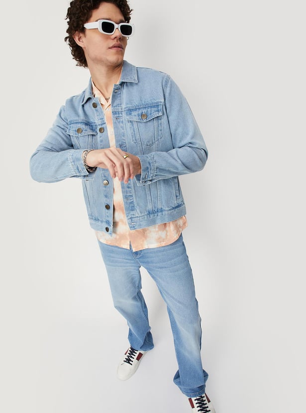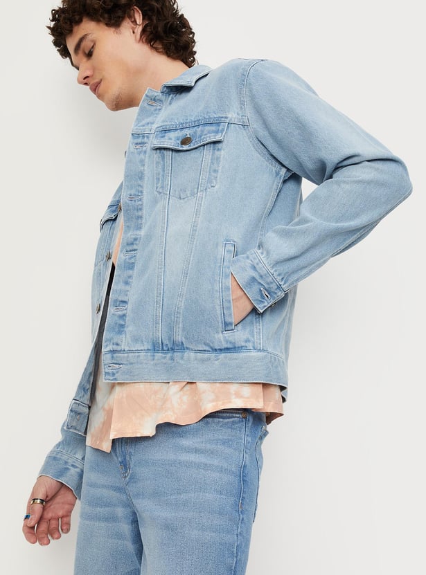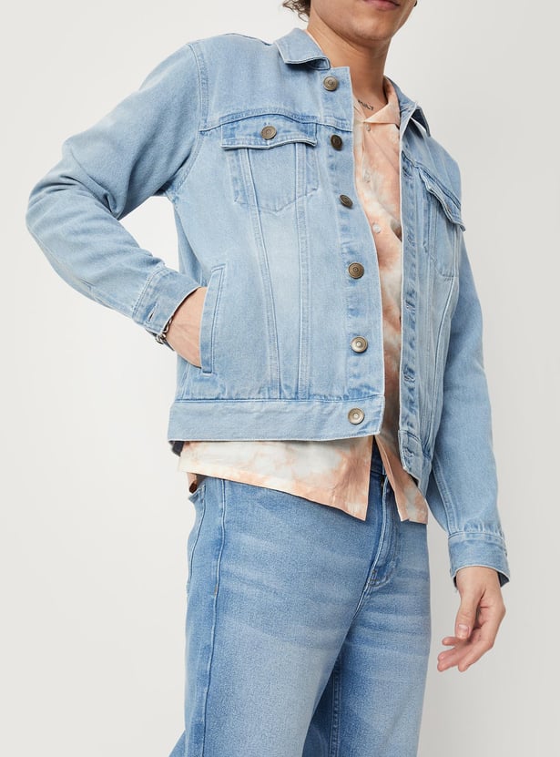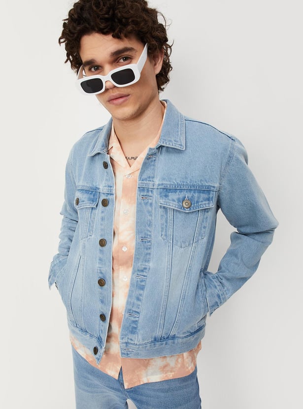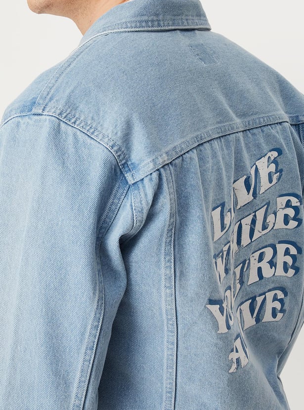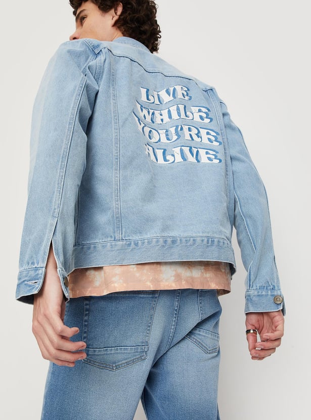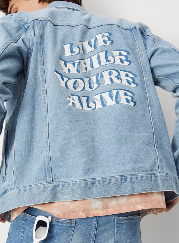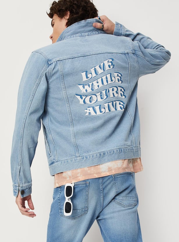 Dress up or dress down your look with this denim trucker jacket. It features a spread collar, a typographic print at the back, long sleeves, buttoned cuffs, buttoned flap pockets at the chest, and waist pockets. Ace the style by layering this jacket over a shirt and teaming it up with jeans and sneakers.