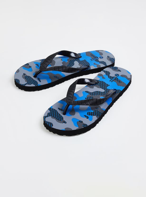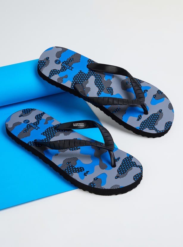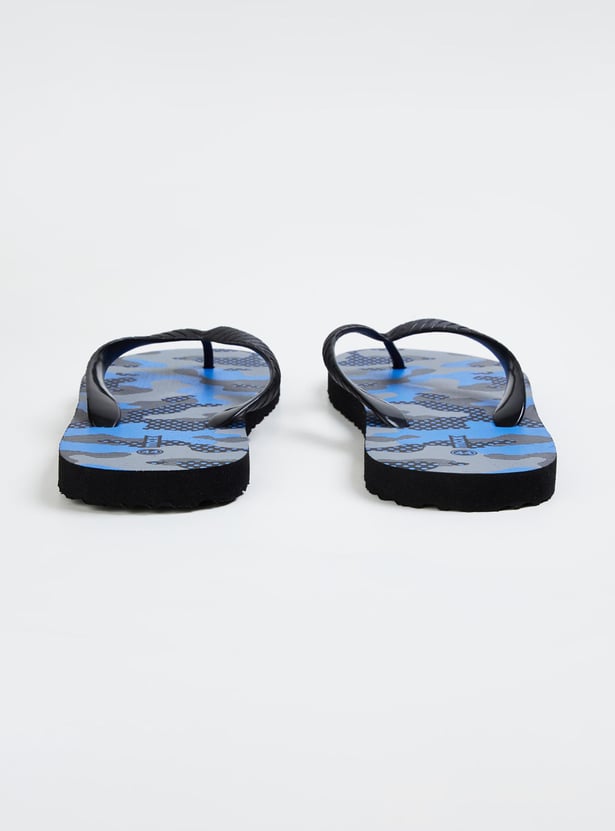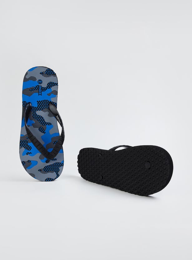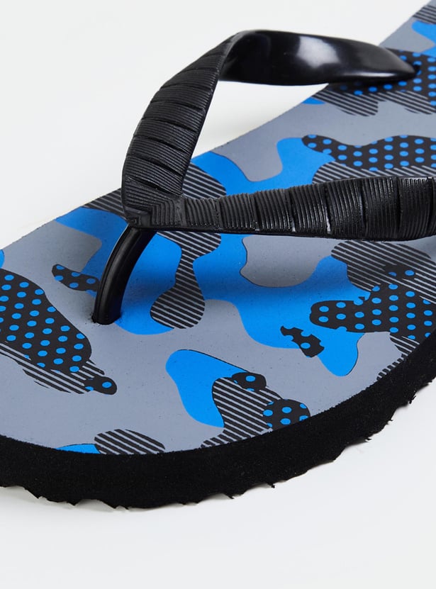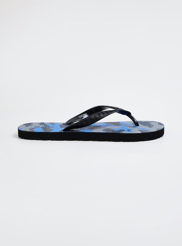 Enjoy comfort and style in or out of your home in this pair of flip-flops. It features a textured v-strap, open toe, printed footbed, and patterned outsole for added grip.
