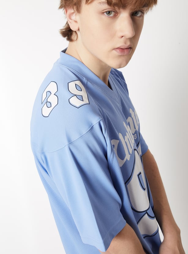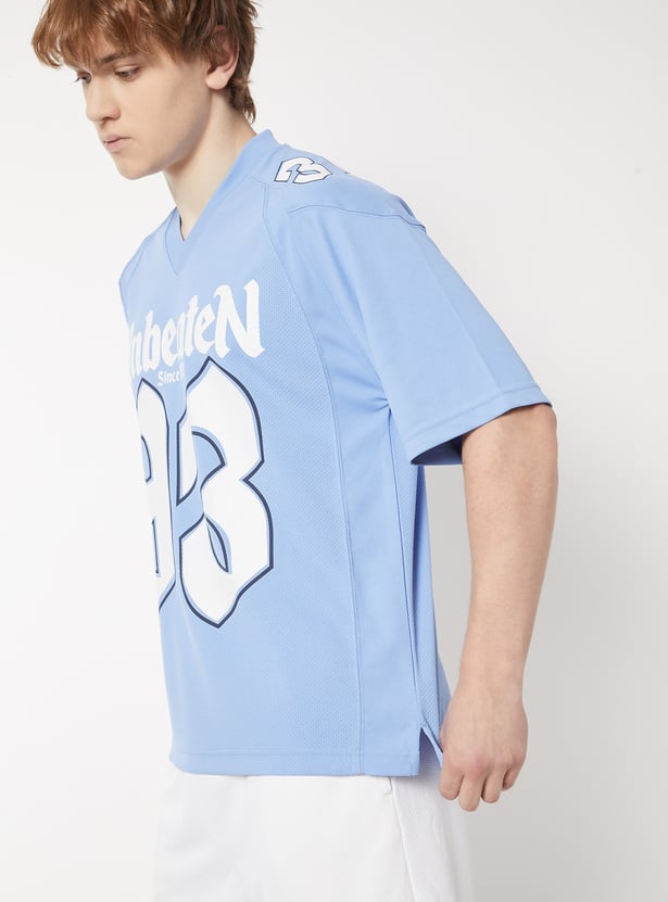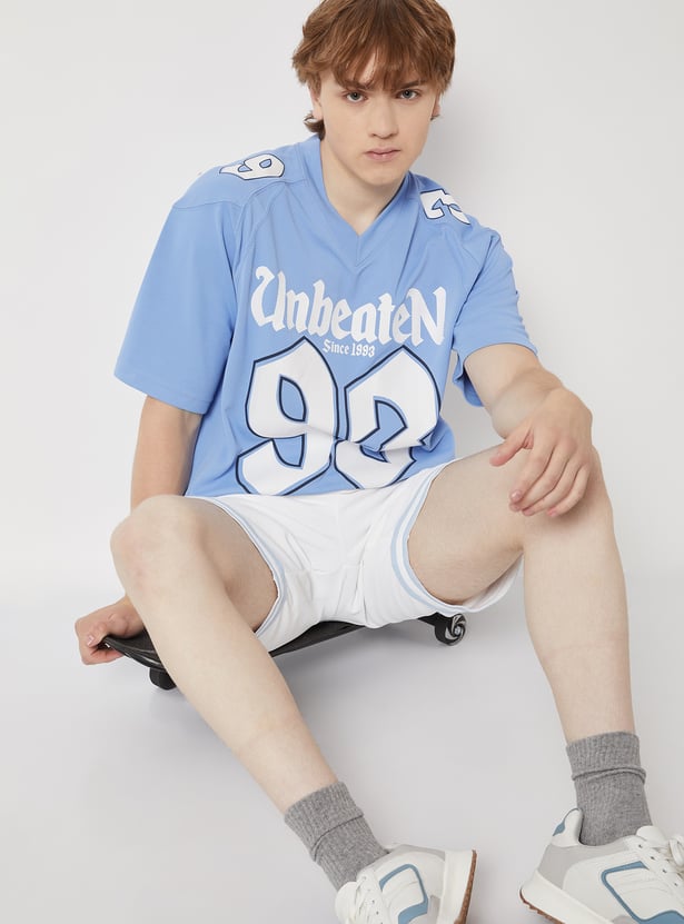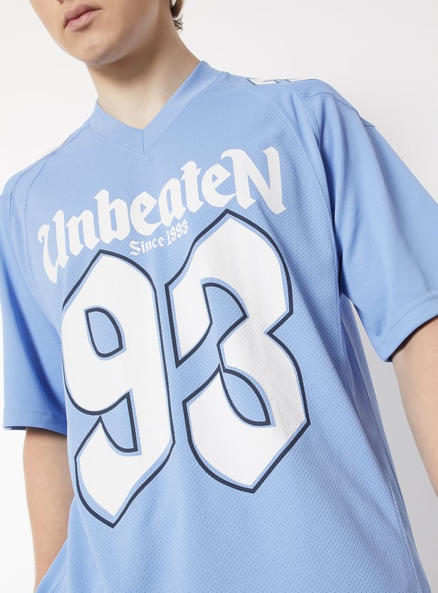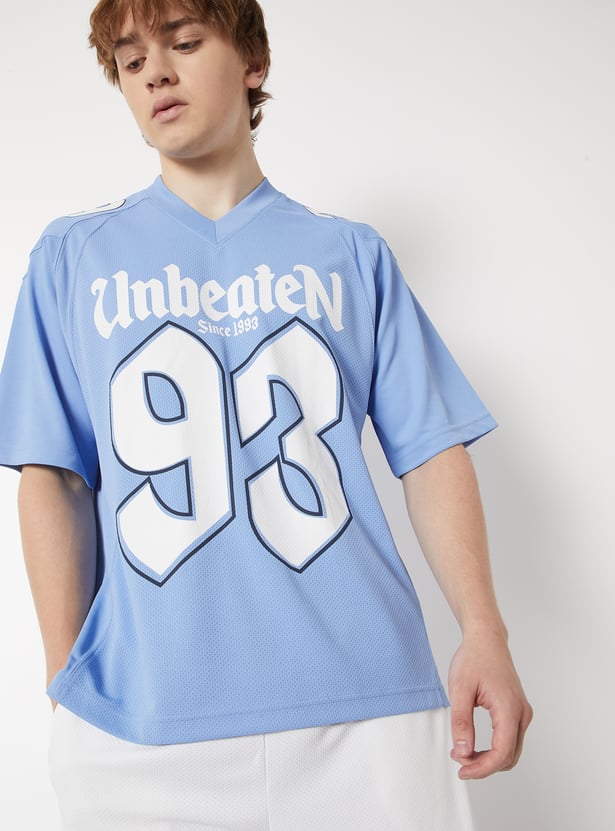 Stay comfortable and on-trend with this printed oversized sports T-shirt, featuring a classic V-neck and half sleeves. Designed for ease of movement and everyday wear.