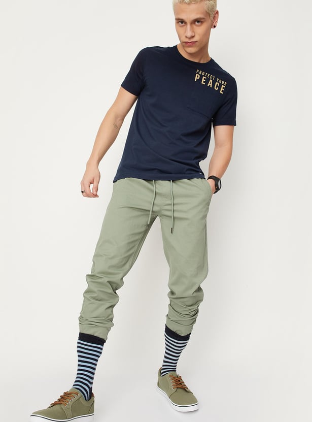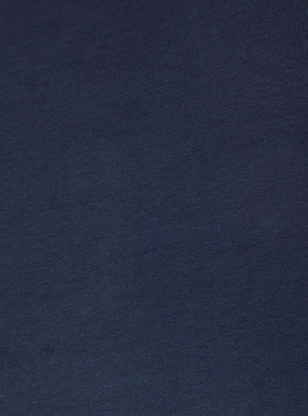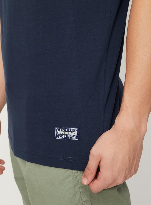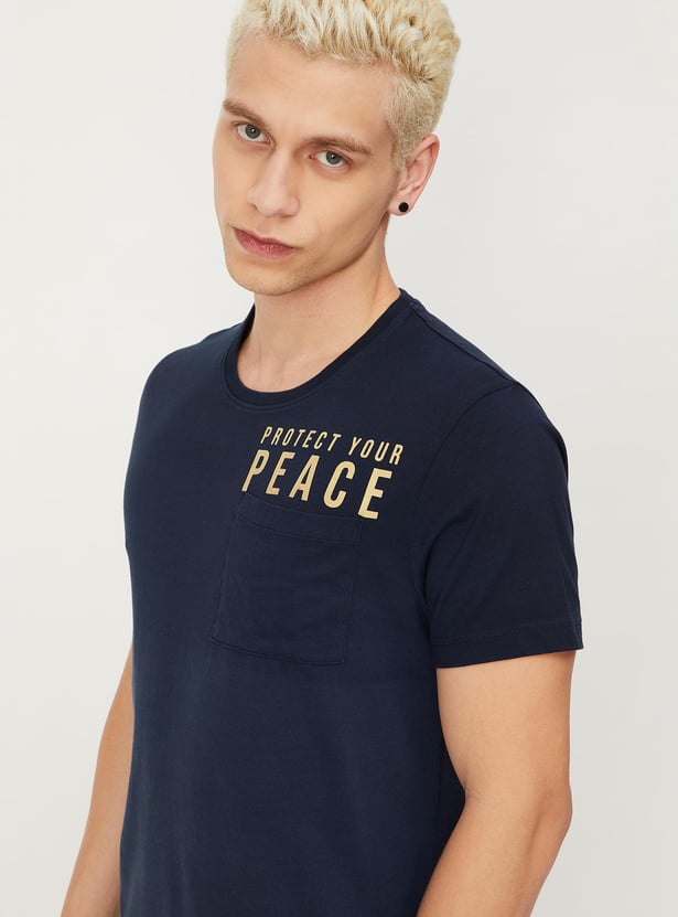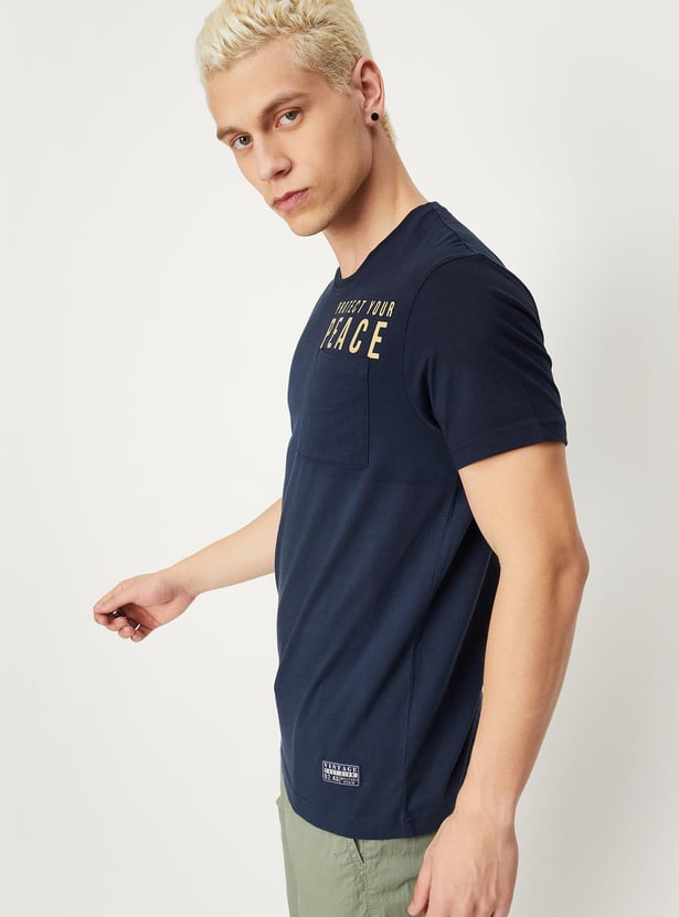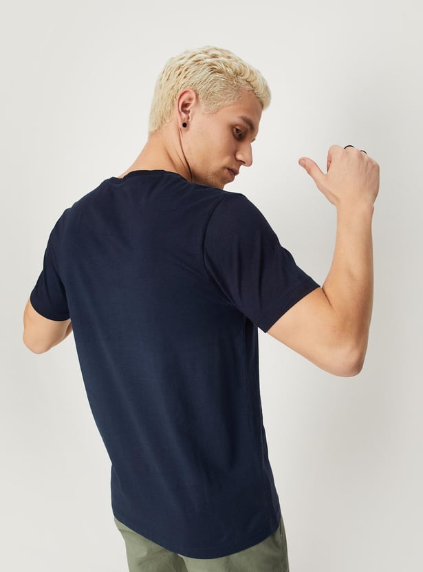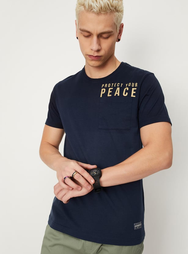 Build your basic wardrobe with this T-shirt highlighted with a typographic print at the chest. It is styled with a crew neck, short sleeves, a patch pocket at the chest, and a slim fit profile. Team up this tee with joggers and sneakers to ace the off-duty look.