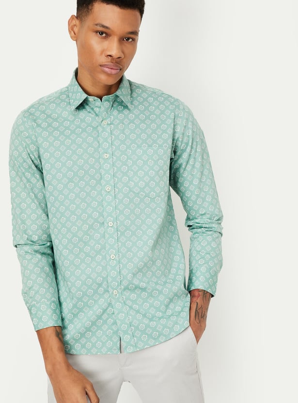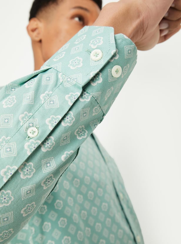 Upgrade your style with this printed shirt. With a spread collar, full sleeves, and buttoned cuffs, it adds vibrancy to your wardrobe. Complete with a patch pocket and curved hemline, it's the perfect blend of sophistication and individuality.