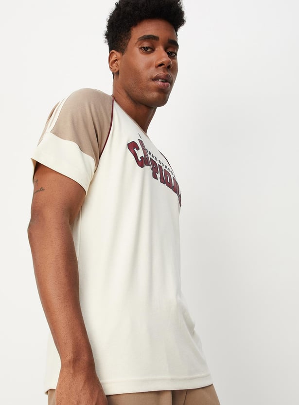Rule the court in this T-shirt highlighted with a colourblock design and typographic print on the chest. It has a crew neck, raglan sleeves, and a slim-fit profile. Pair this tee with shorts and sneakers to ace the style.