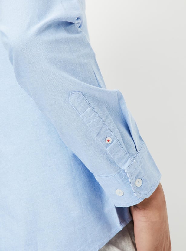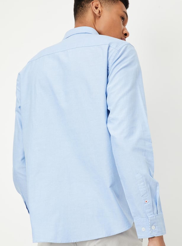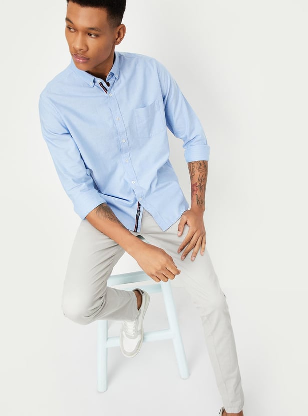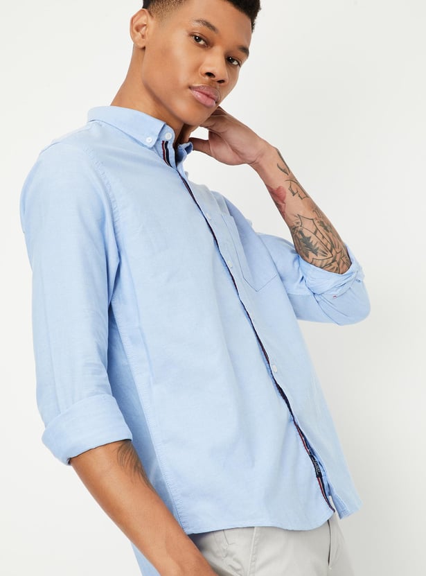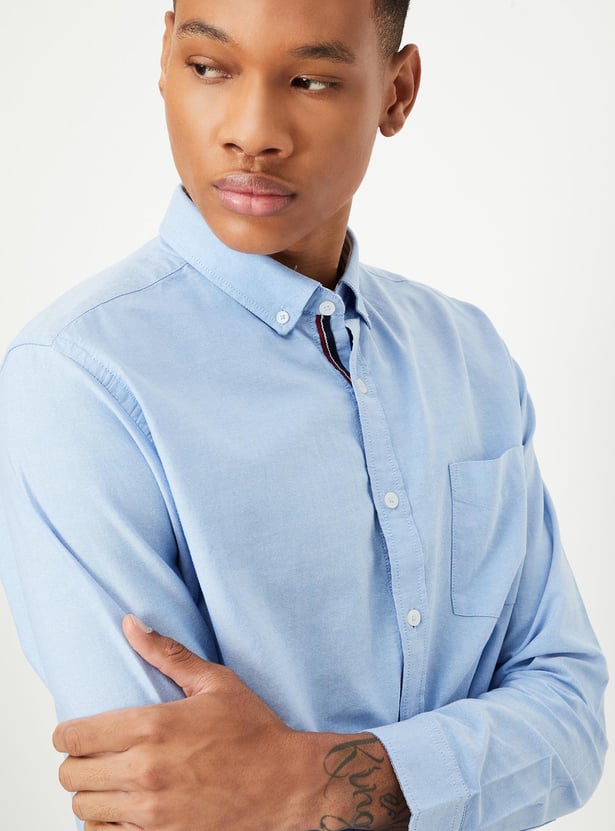 Elevate your casual style with this solid shirt, embodying modern sophistication with its button-down collar, full sleeves, patch pocket, and button placket.