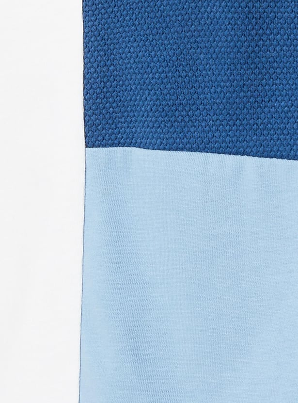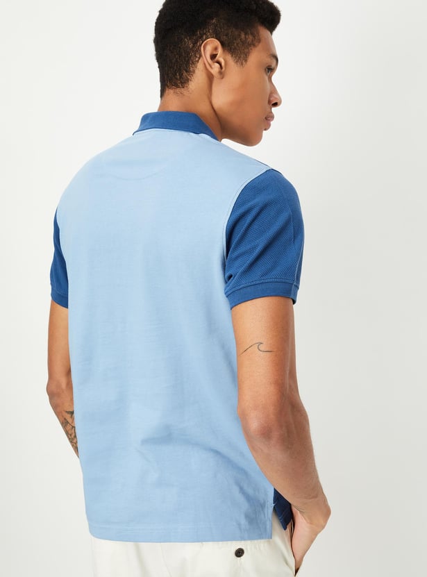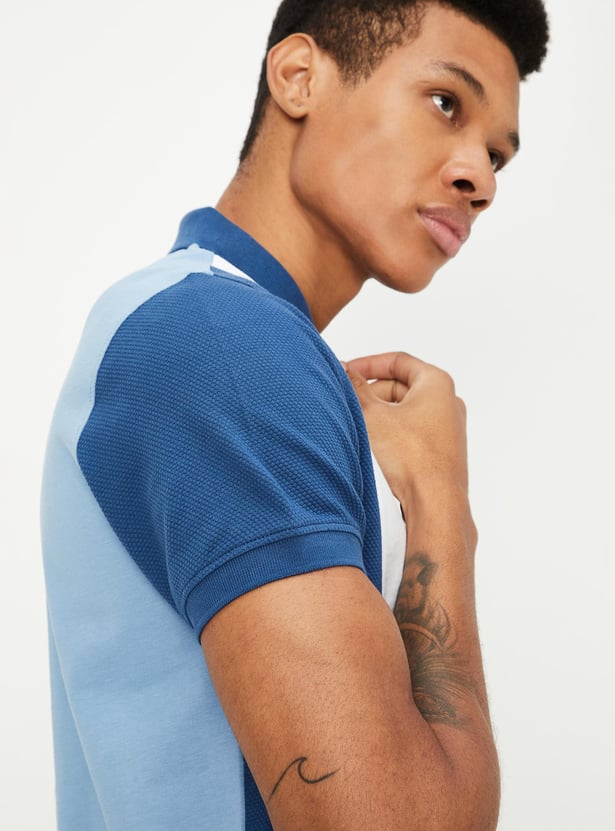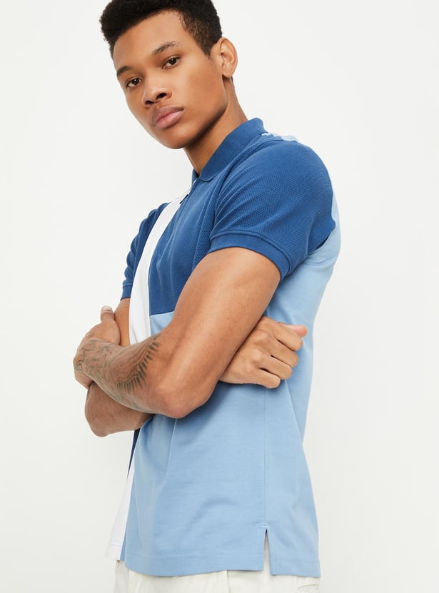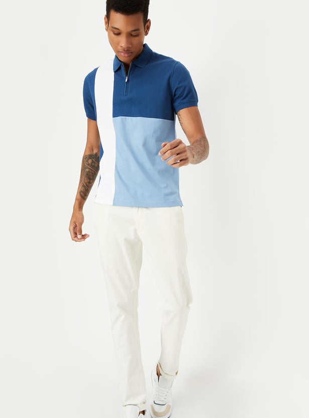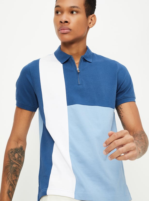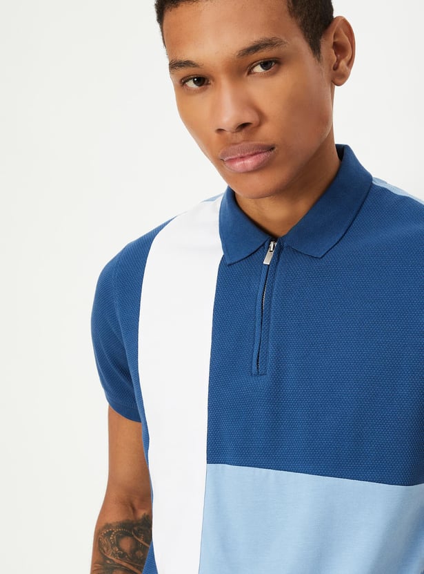 Step up your street style with this T-shirt. It features a colour-blocked design, a polo collar with zip placket and short sleeves.