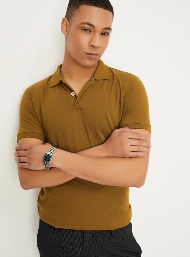 A perfect mix of smart and casual, this T-shirt is rendered in a solid tone. It features a polo collar, short sleeves, a 2-button placket, ribbed trim, and side slits at the hem. Style this polo with a pair of trousers and sneakers for a sharp look.