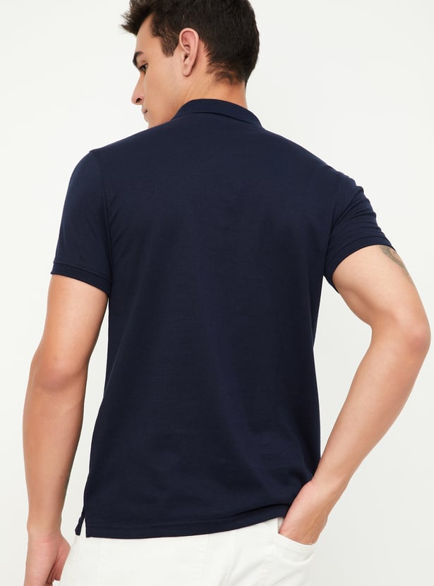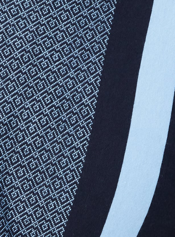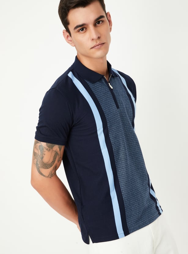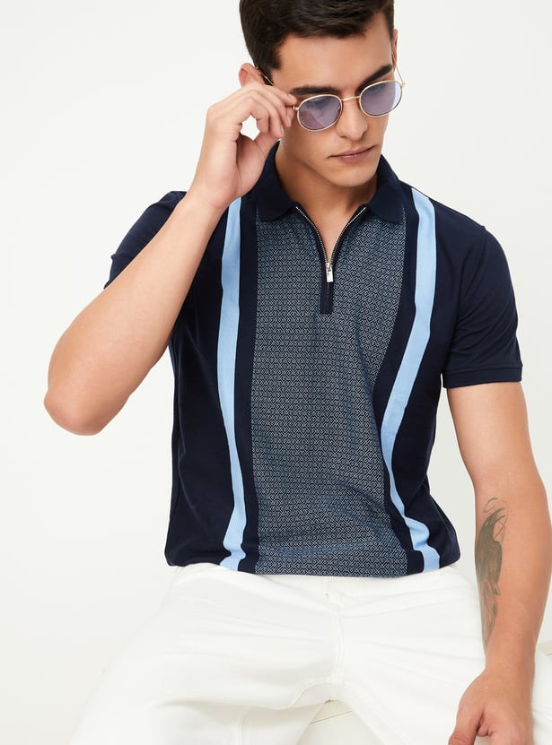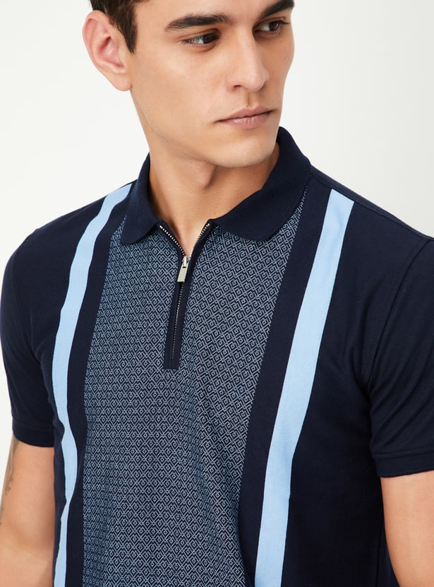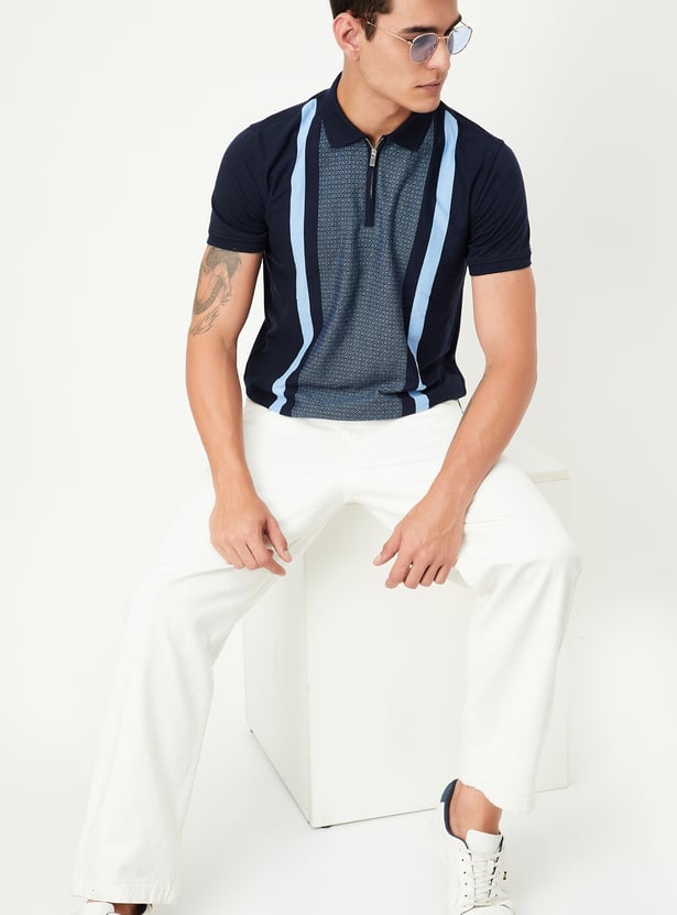 Elevate your style effortlessly with this T-shirt. Designed with a polo collar, it has a zip placket, half sleeves, and an even slit hem. The stripes and woven design add a striking look.
