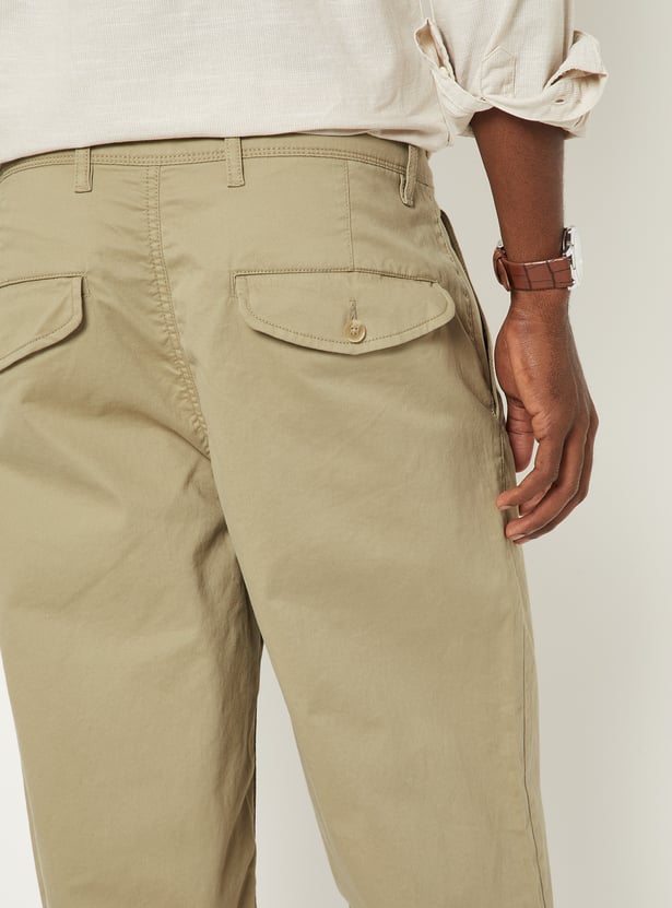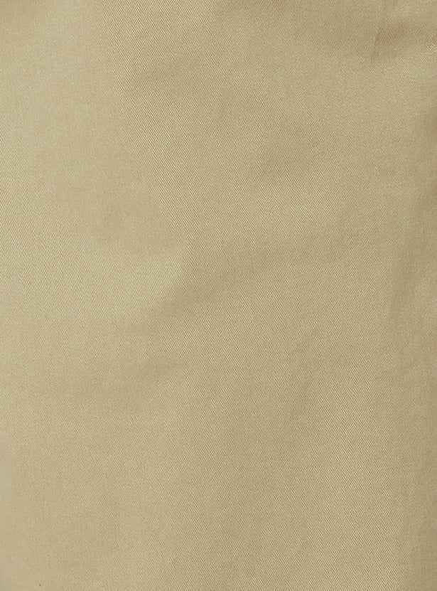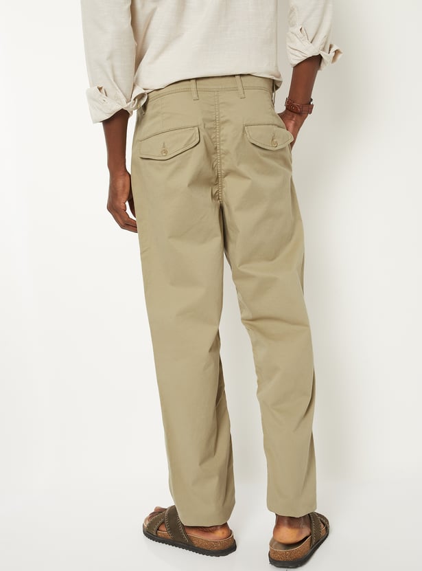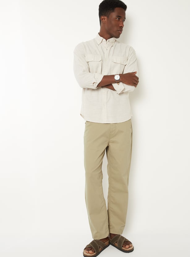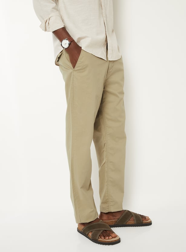 Classic and versatile, these solid regular fit trousers feature a comfortable mid-rise waist with a secure button closure. Designed with sturdy belt loops and functional pockets, they offer both practicality and a polished look, making them ideal for everyday wear or semi-formal occasions.