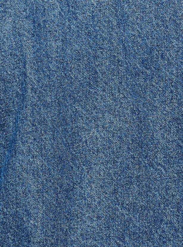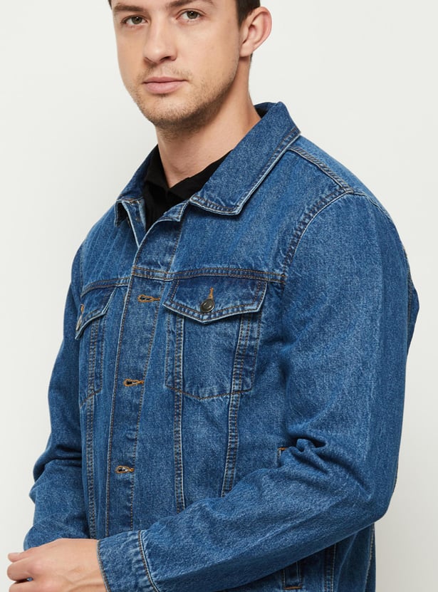 Featuring a stonewashed effect, this denim jacket is complemented with a button closure, flap pockets, and full sleeves.