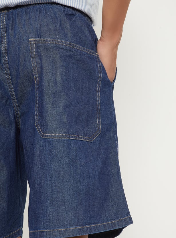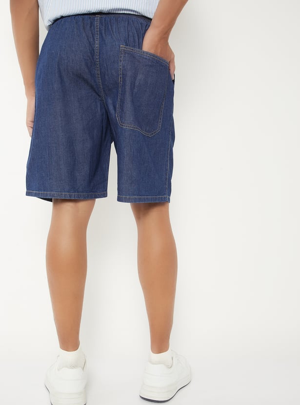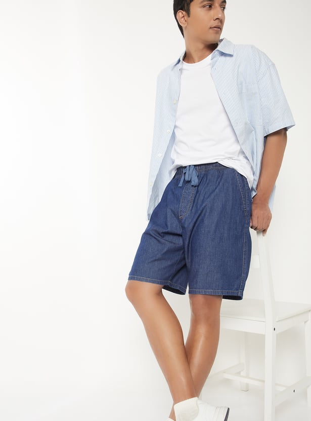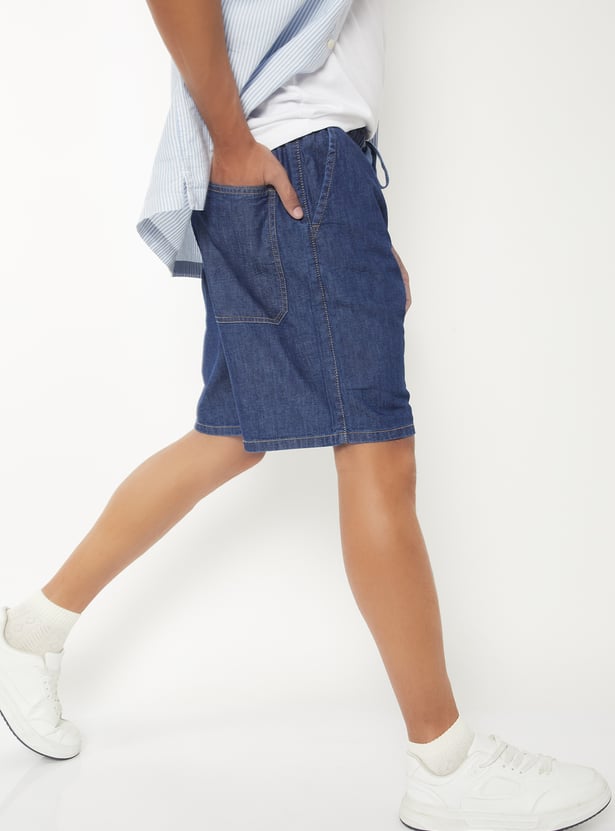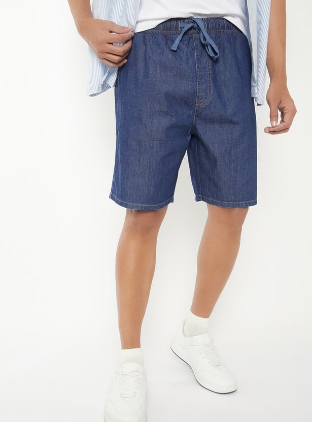 Keep your look casual and comfy with these solid denim shorts. Designed with an elasticated waist, handy pockets, and a functional drawstring, they offer both style and ease of movement.