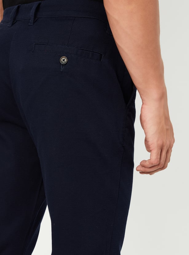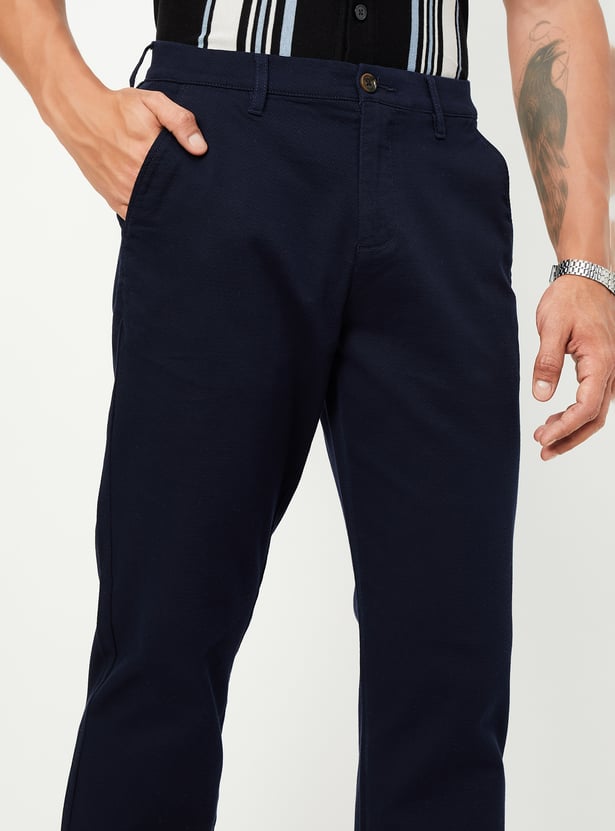 Featuring a slim fit, these chinos offer a tailored appearance. The innovative flexi waist design ensures a flexible, adjustable fit. This pair is designed with a belt loop waist, cross pockets, and buttoned welt pockets.