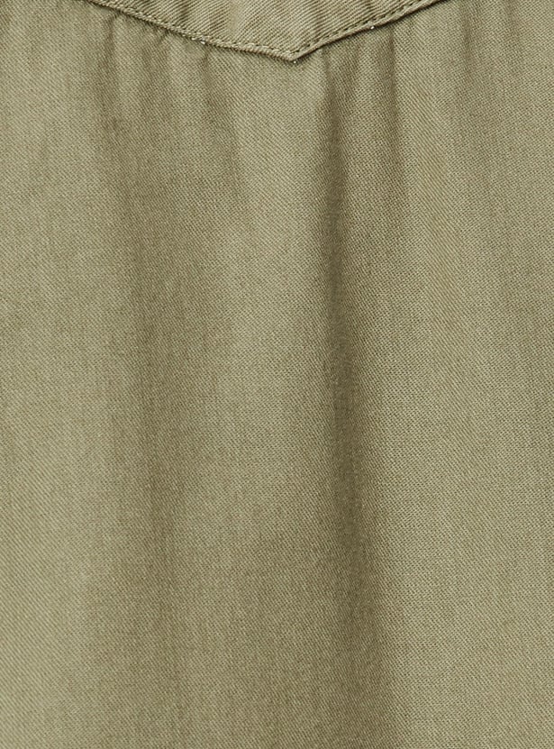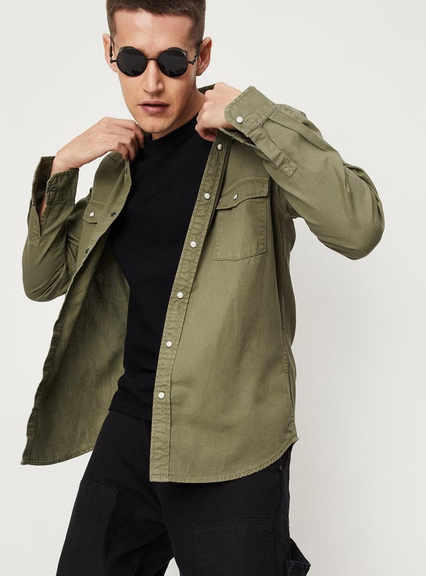 A year-round favourite, this casual shirt is rendered in a solid tone and tailored in a slim fit profile. It features a spread collar, long sleeves, buttoned cuffs, double-buttoned flap pockets, and a curved hem. Layer this shirt over a basic tee and pair it with jeans and sneakers to ace the look.