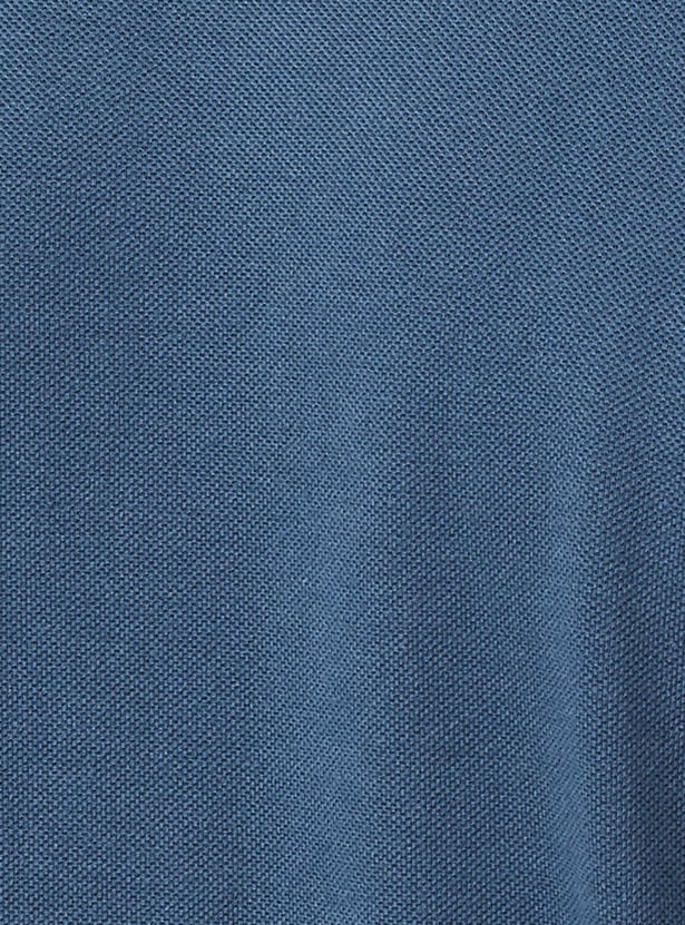 Step up your style with this regular-fit T-shirt. Rendered in a solid tone, it has an even vented hem and half sleeves with ribbed trim. The polo collar gives a smart touch to this T-shirt.