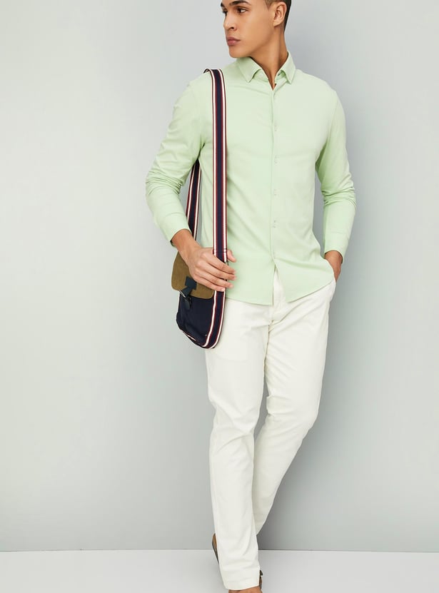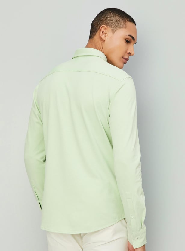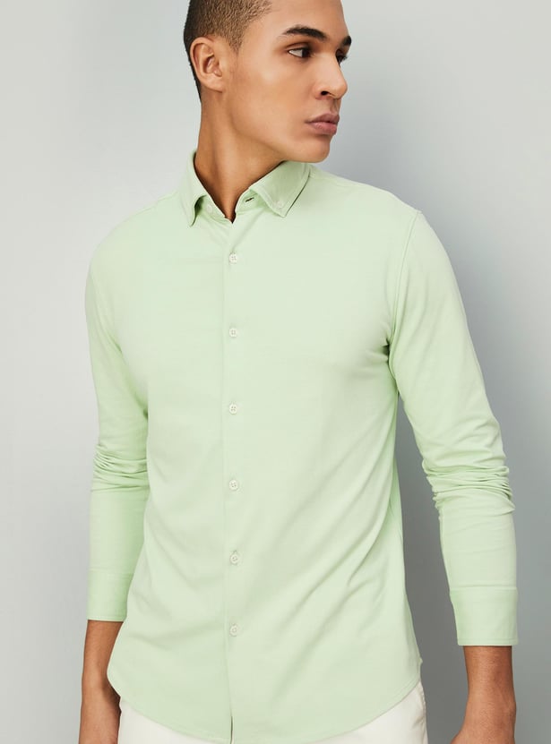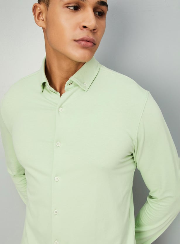 Infuse your wardrobe with sophistication and versatility by adding this solid shirt, complete with a spread collar, full sleeves with buttoned cuffs, a curved hemline, and a button-down front, offering a monochromatic design that effortlessly transitions between both formal and casual occasions.