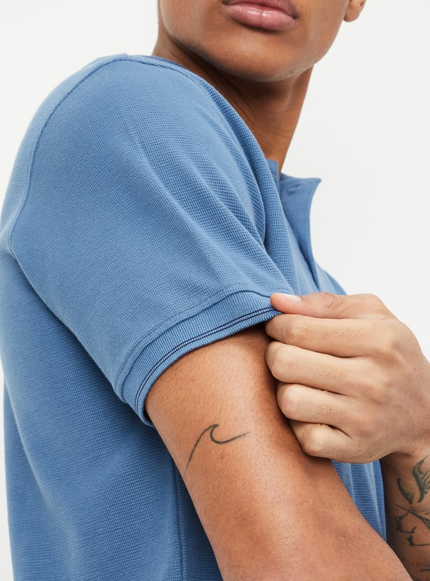 Elevate your casual style with our solid polo T-shirt. Classic polo collar, half sleeves, and a two-button placket offer refined comfort.