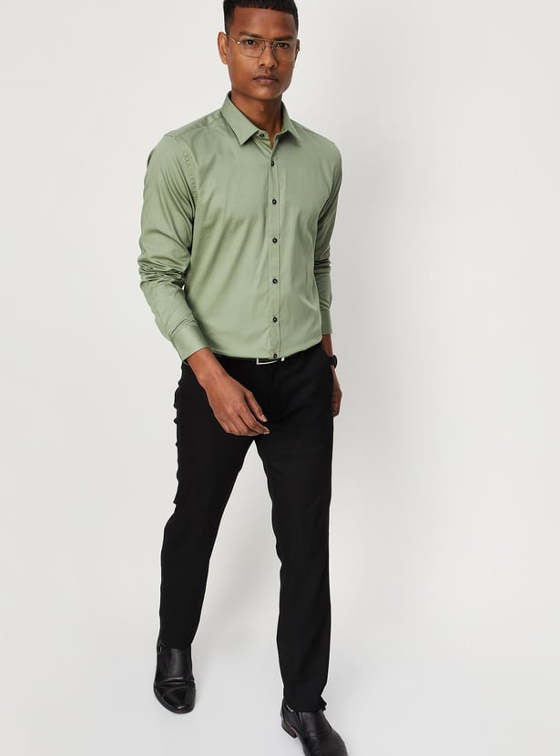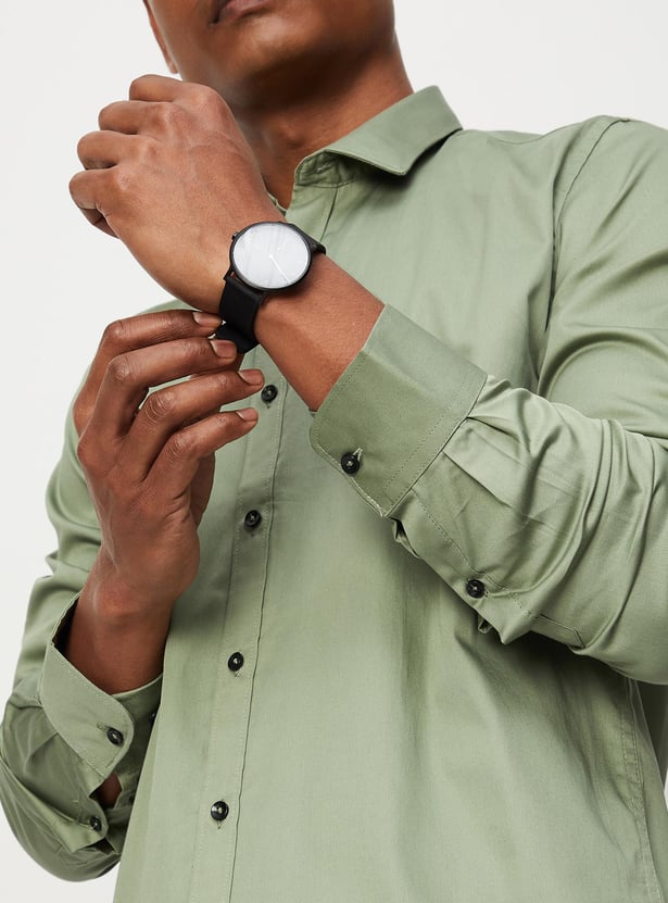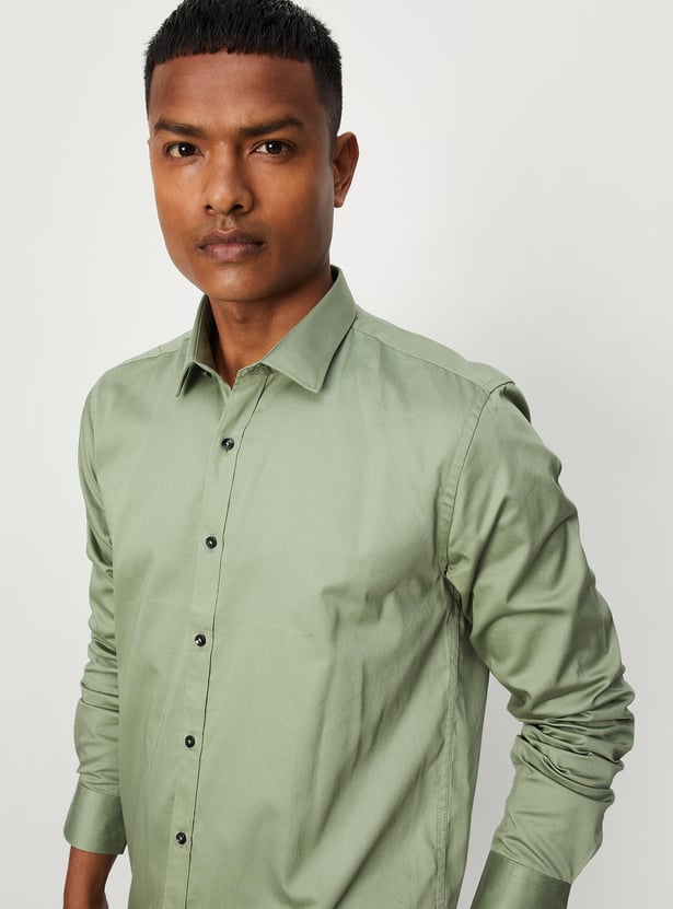 It's time to blend style and elegance into your formal attire with this solid sateen shirt. It flaunts a spread collar, full sleeves with button cuffs, and a button placket. Team it up with a pair of formal trousers and shoes for a complete look.