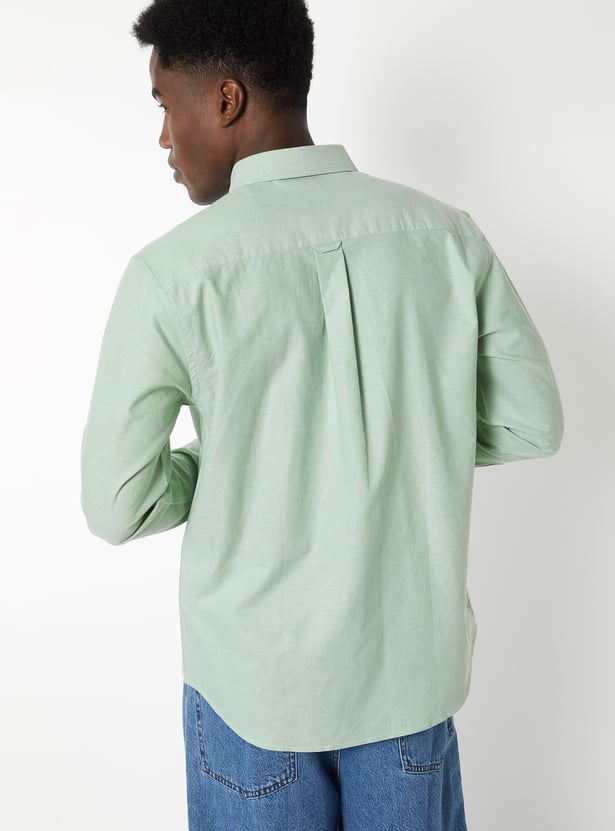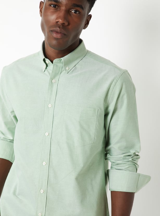 This solid slim-fit shirt is designed for a sharp, contemporary look. It features full cuffed sleeves, a button placket, a button-down collar, a patch pocket, and a curved hem for a refined finish.