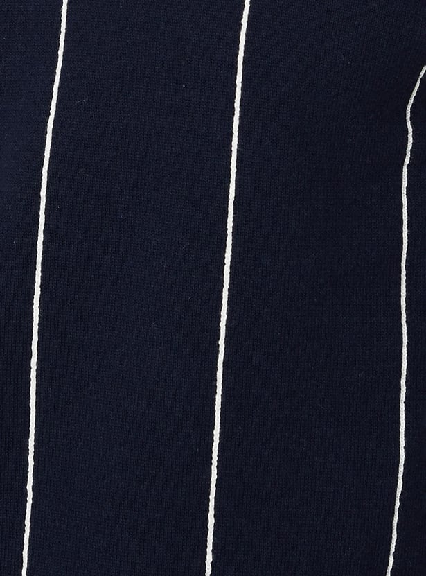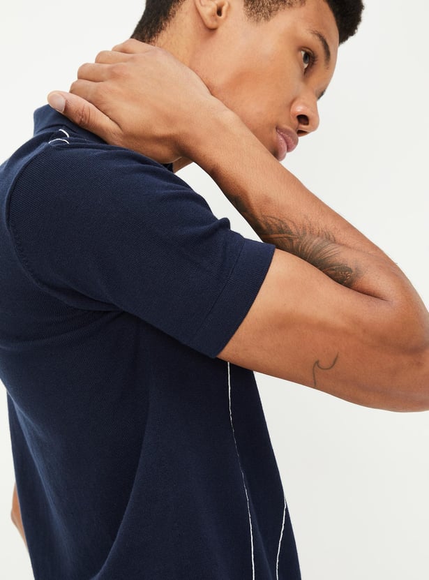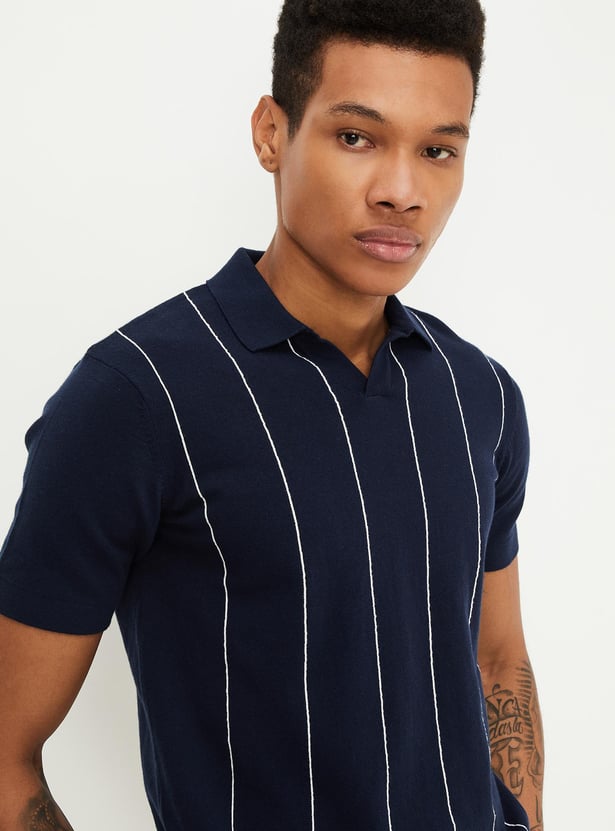 Look sporty and cosy in this T-shirt featuring a knit design and a striped pattern. It has a polo collar, half sleeves, and ribbed trim.