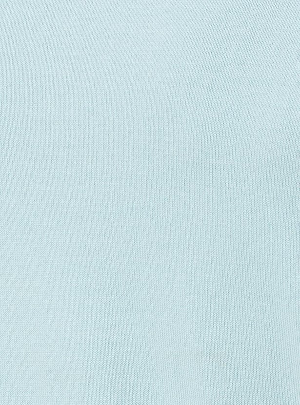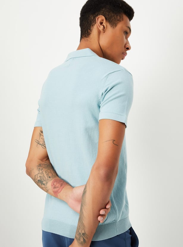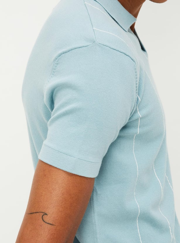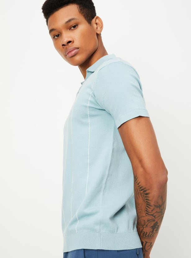 Look sporty and cosy in this T-shirt featuring a knit design and a striped pattern. It has a polo collar, half sleeves, and ribbed trim.