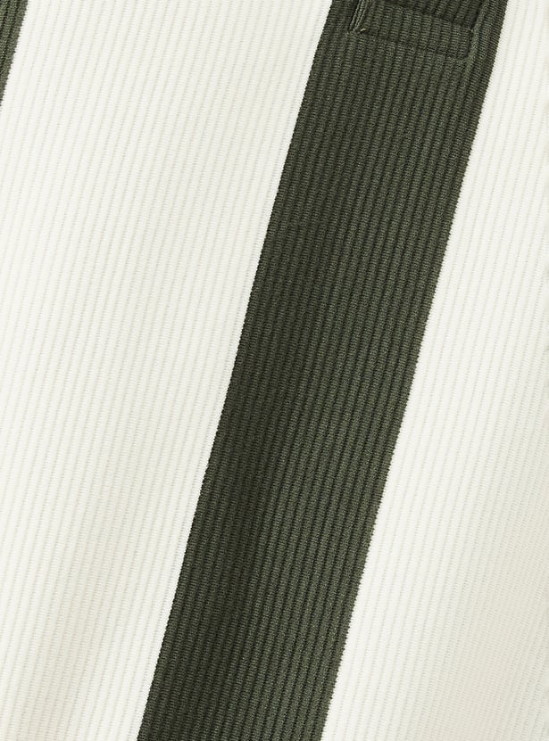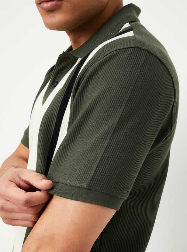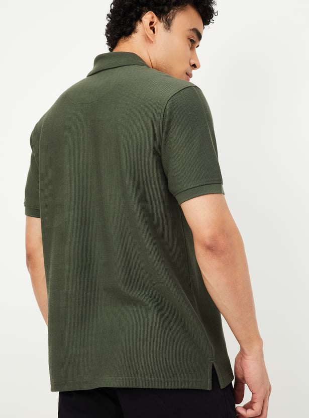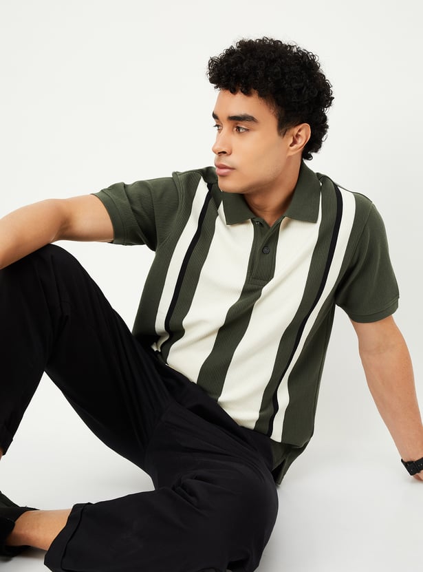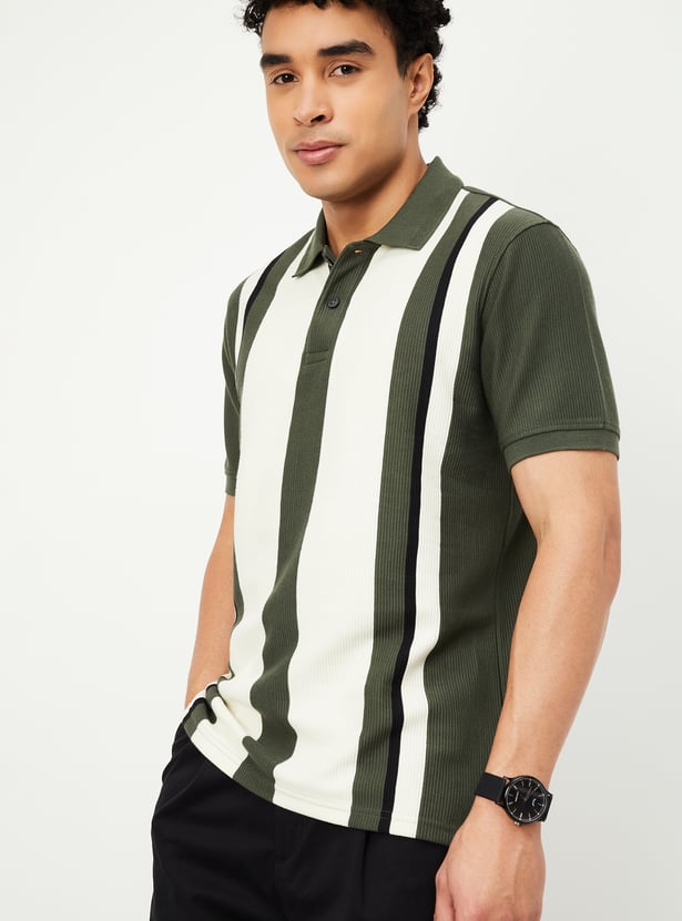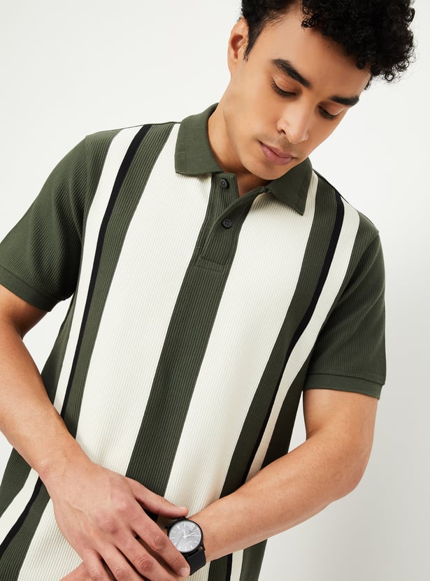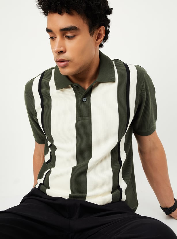 Enhance your weekend wardrobe with this polo T-shirt. It includes a polo collar, half sleeves and a two-button placket that completes the utility aspect of the style. Additionally, a unique striped pattern makes it a captivating choice.