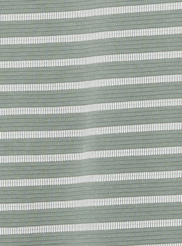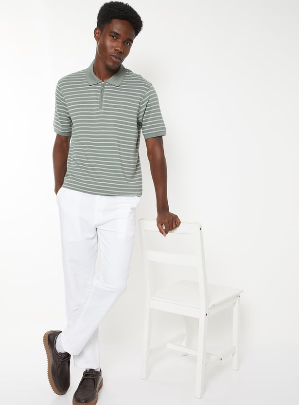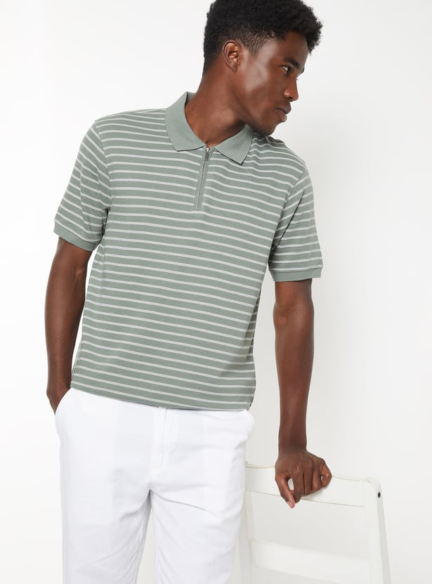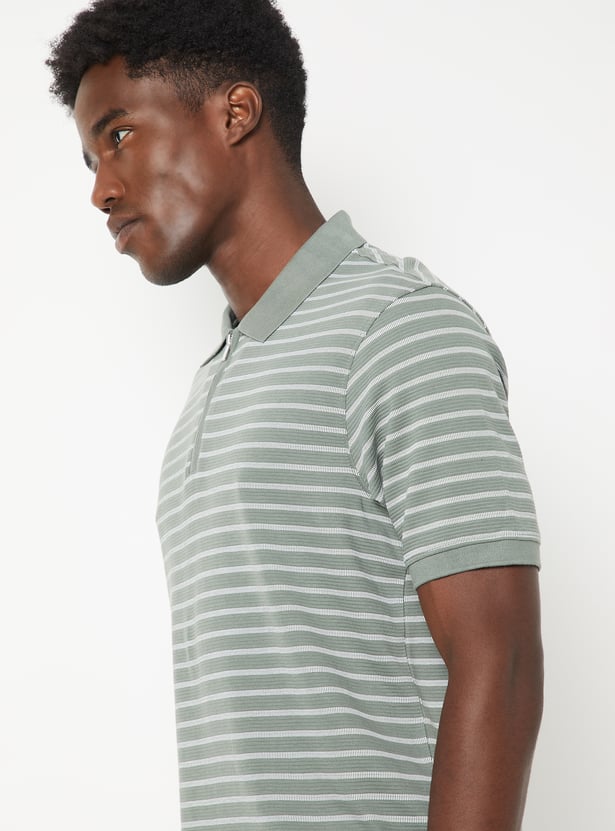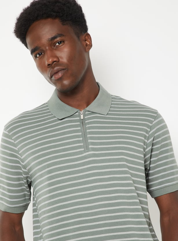 Add a sporty touch to your everyday style with this striped polo T-shirt featuring a polo collar, zip closure, and half sleeves. The clean stripes lend a modern, athletic edge to your casual look.