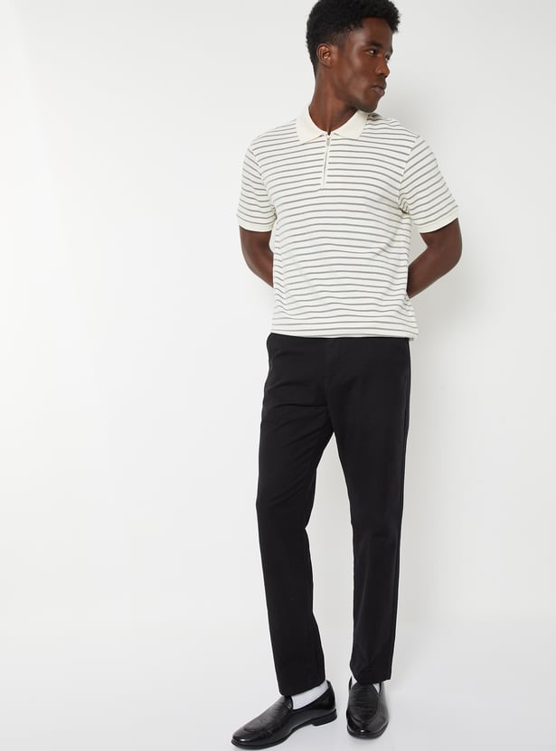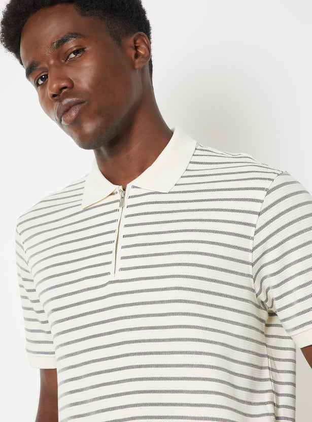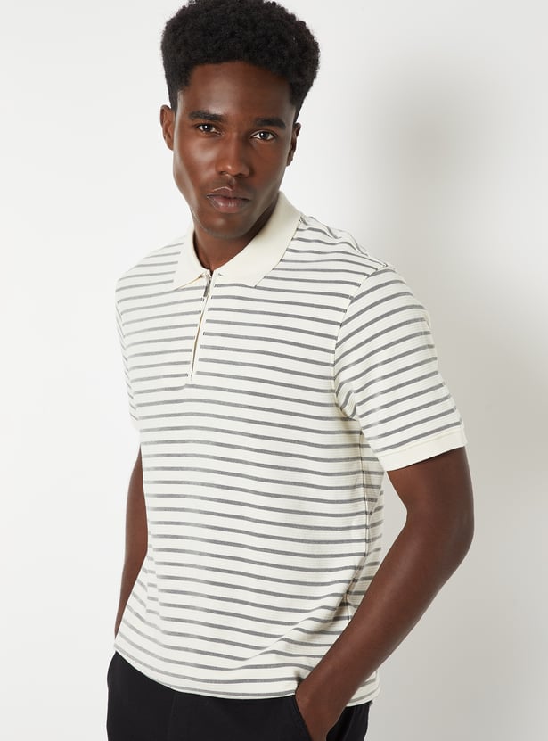 Add a sporty touch to your everyday style with this striped polo T-shirt featuring a polo collar, zip closure, and half sleeves. The clean stripes lend a modern, athletic edge to your casual look.