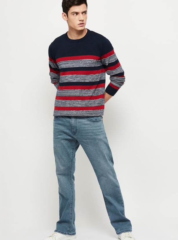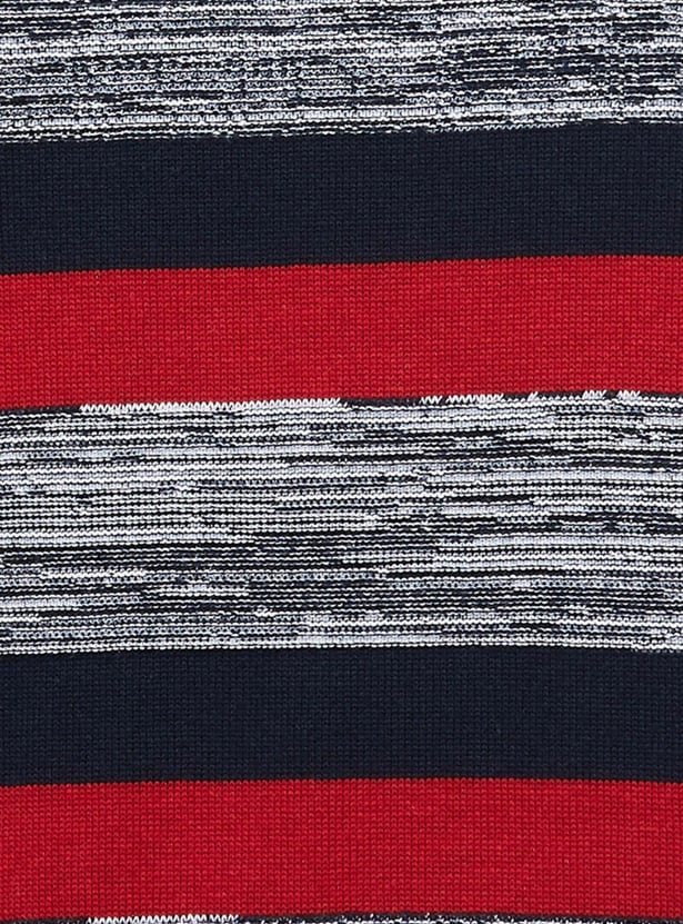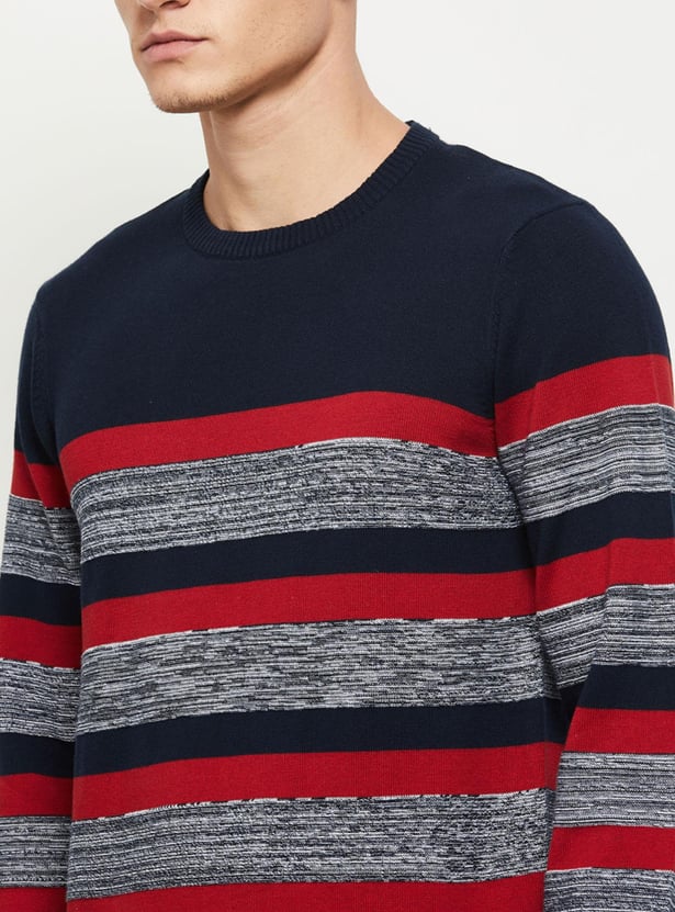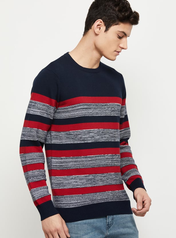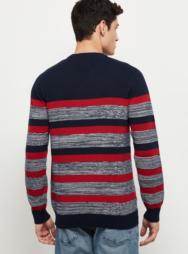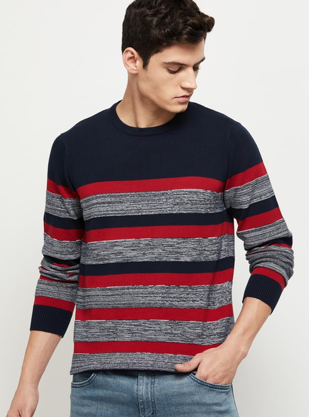 Get winter-ready with this pullover that comes with a striped pattern on the surface, crew neck, and full sleeves. Style it over a polo T-shirt and jeans for a winter-ready look.