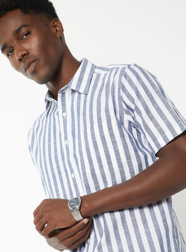 This classic striped shirt features a smart spread collar and a neat button placket. Designed with half sleeves, it also includes a practical patch pocket for everyday ease.